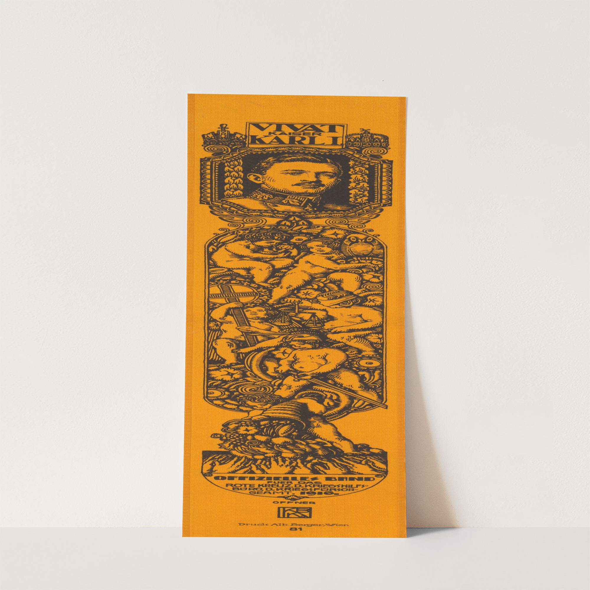 This striking art print features "Vivat Kaiser Karl I." by Alfred Offner, rendered in vibrant yellow with intricate black linework. The vertical composition includes an upper portrait of Emperor Charles I, framed intricately and presented at the top. Below, a...