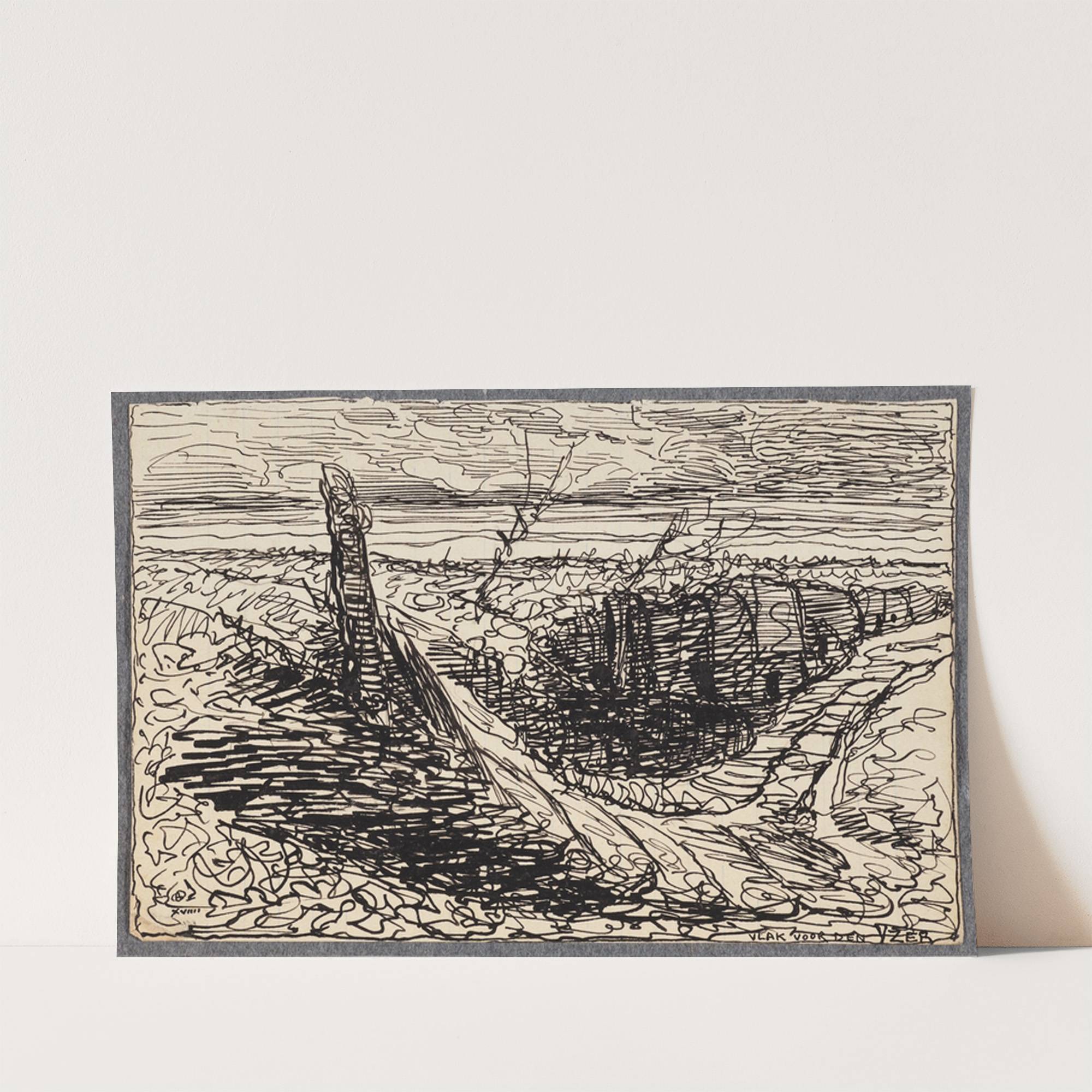 This striking black-and-white linocut print titled "Ypres Remember (1919)" is a powerful depiction of a World War I battlefield scene by artist Alfred Ost. The intricate, swirling lines and deep, cross-hatched ink create a somber, yet intense visual impact, capturing...