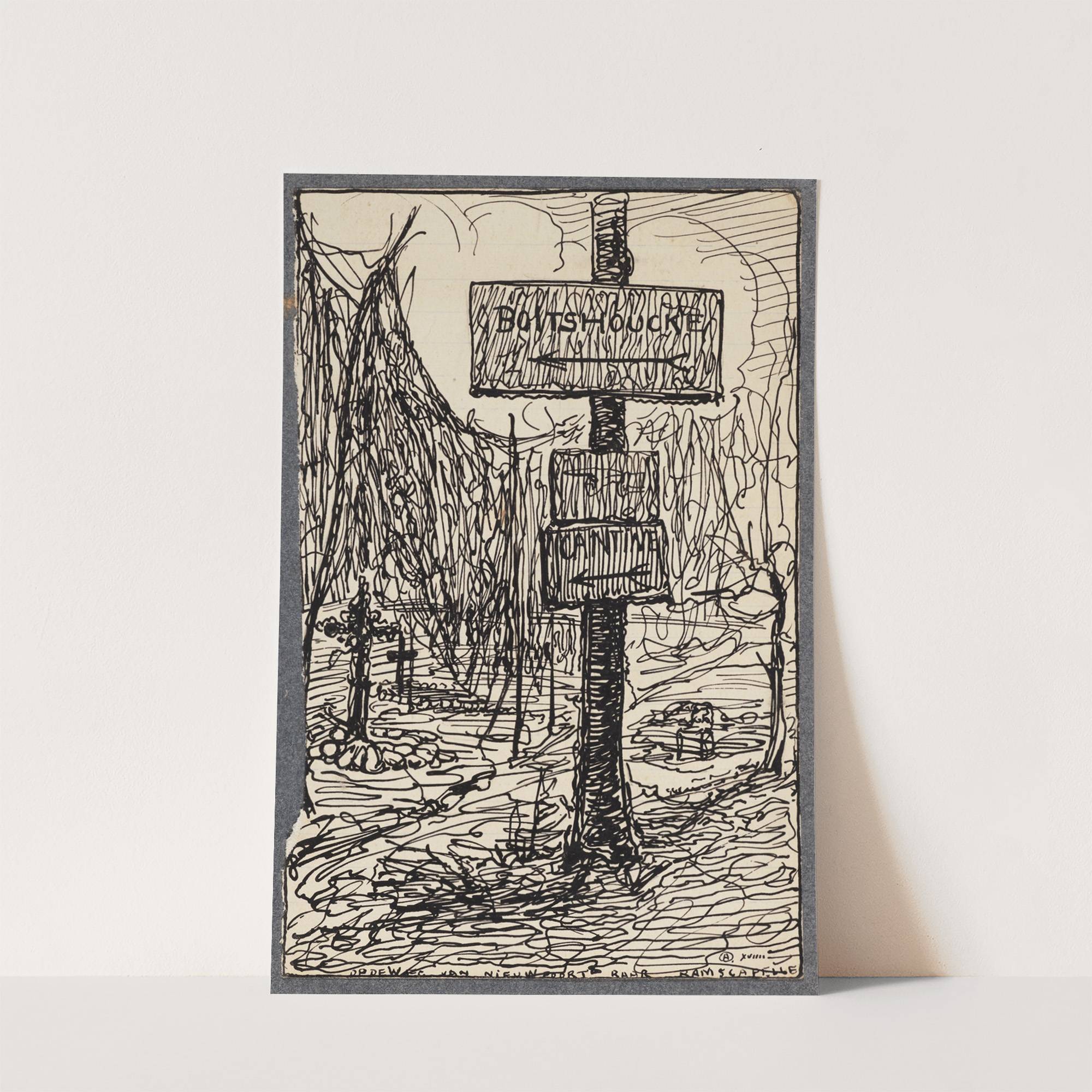 This art print features "Ypres Remember (1919)" by Alfred Ost, showcasing an expressionist, black-and-white line drawing with a rough, energetic texture. The central subject is a tall signpost adorned with multiple rectangular signs, standing prominently in the foreground. The background...