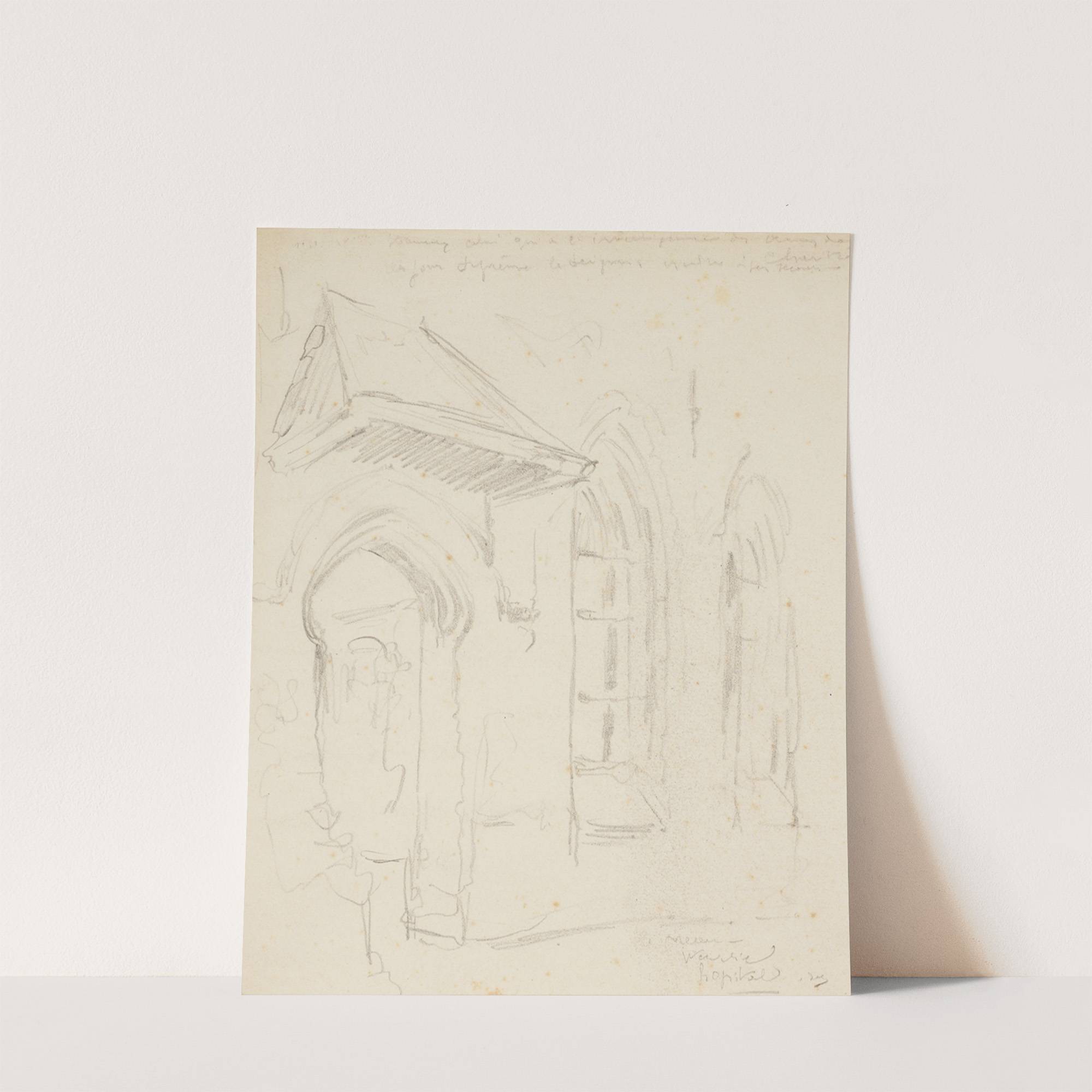 This monochromatic sketch captures a serene architectural scene, reminiscent of early 20th-century European architecture. Drawn in a delicate pencil style, the composition features two prominent arched doorways. The left doorway is slightly more detailed with an intricate arch and what...