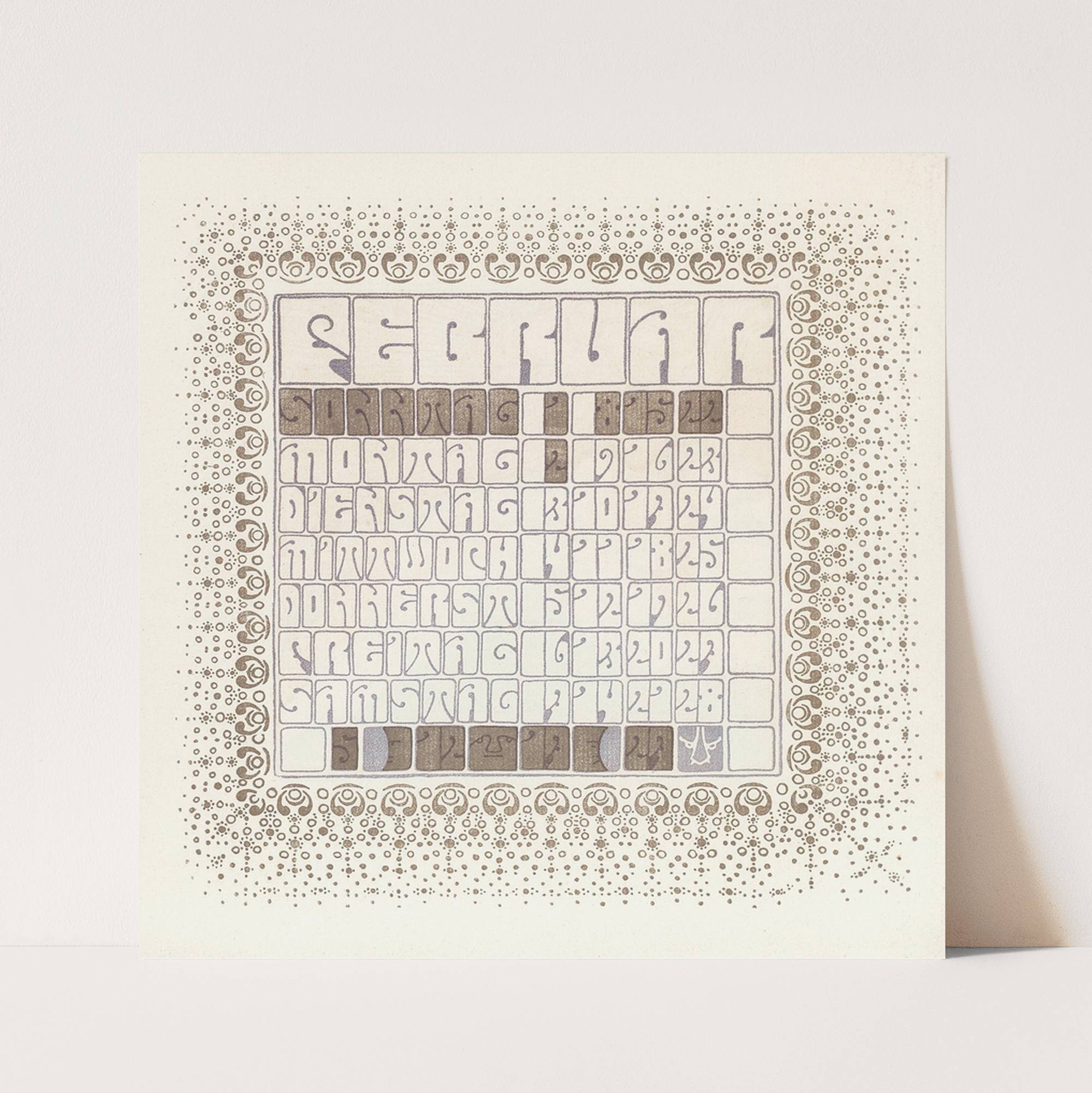 This art print features "February" by Alfred Roller, showcasing a unique and captivating design that combines elements of typography with decorative embellishments. The central focus is a grid-like arrangement of alphabet letters in various sizes, forming a cohesive pattern across...