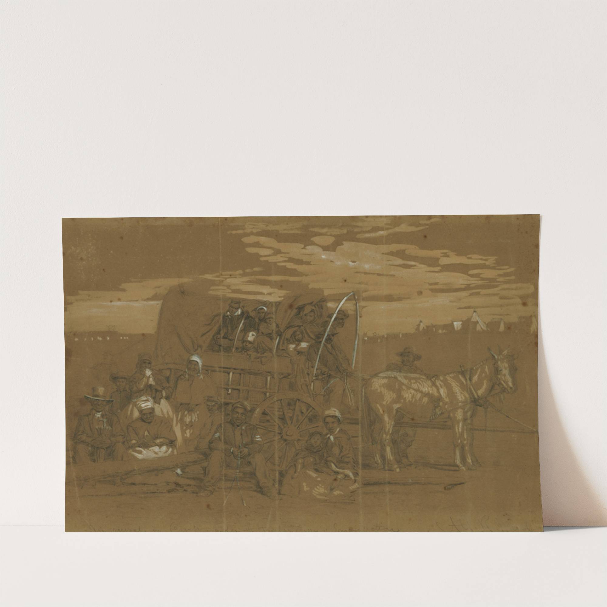 This artwork is "An Arrival in Camp – under the Proclamation of Emancipation" by Alfred Rudolph Waud, rendered in a sepia-toned monochromatic style. It captures a historical moment with remarkable detail and emotion. The scene depicts a group of African...