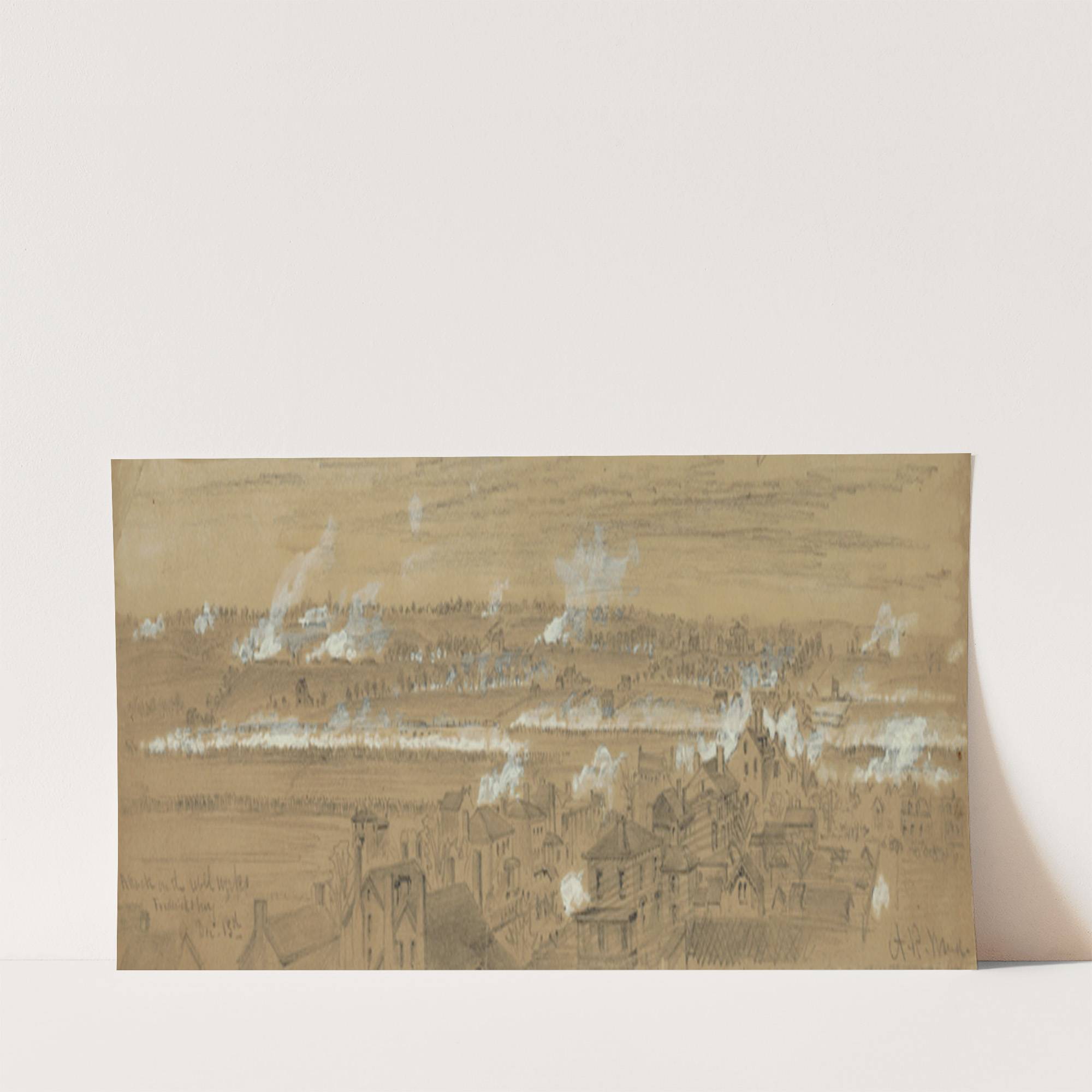 This elegant art print features "Attack on the Rebel Works. Fredericksburg. Dec. 13th" by Alfred Rudolph Waud, capturing the historic battle scene in detailed and meticulous line work. The image is rendered in a sepia tone, giving it an aged,...