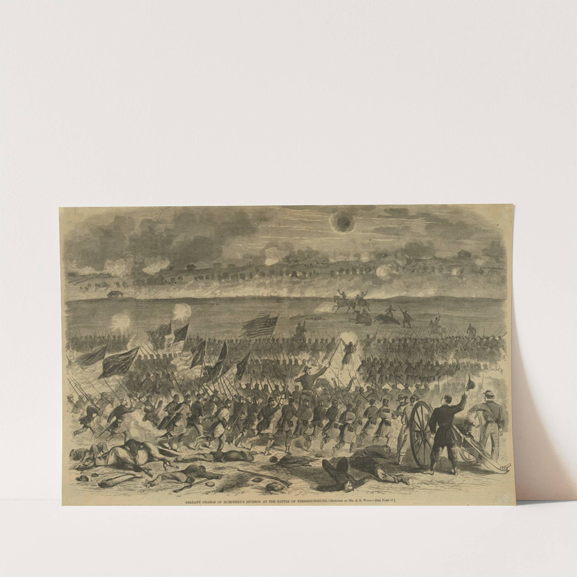 This historical illustration captures the intense chaos of a Civil War battlefield scene titled "Gallant Charge of Humphrey's Division at the Battle of Fredericksburg" by Alfred Rudolph Waud. The monochromatic artwork is rendered in intricate black and white linocut, showcasing...