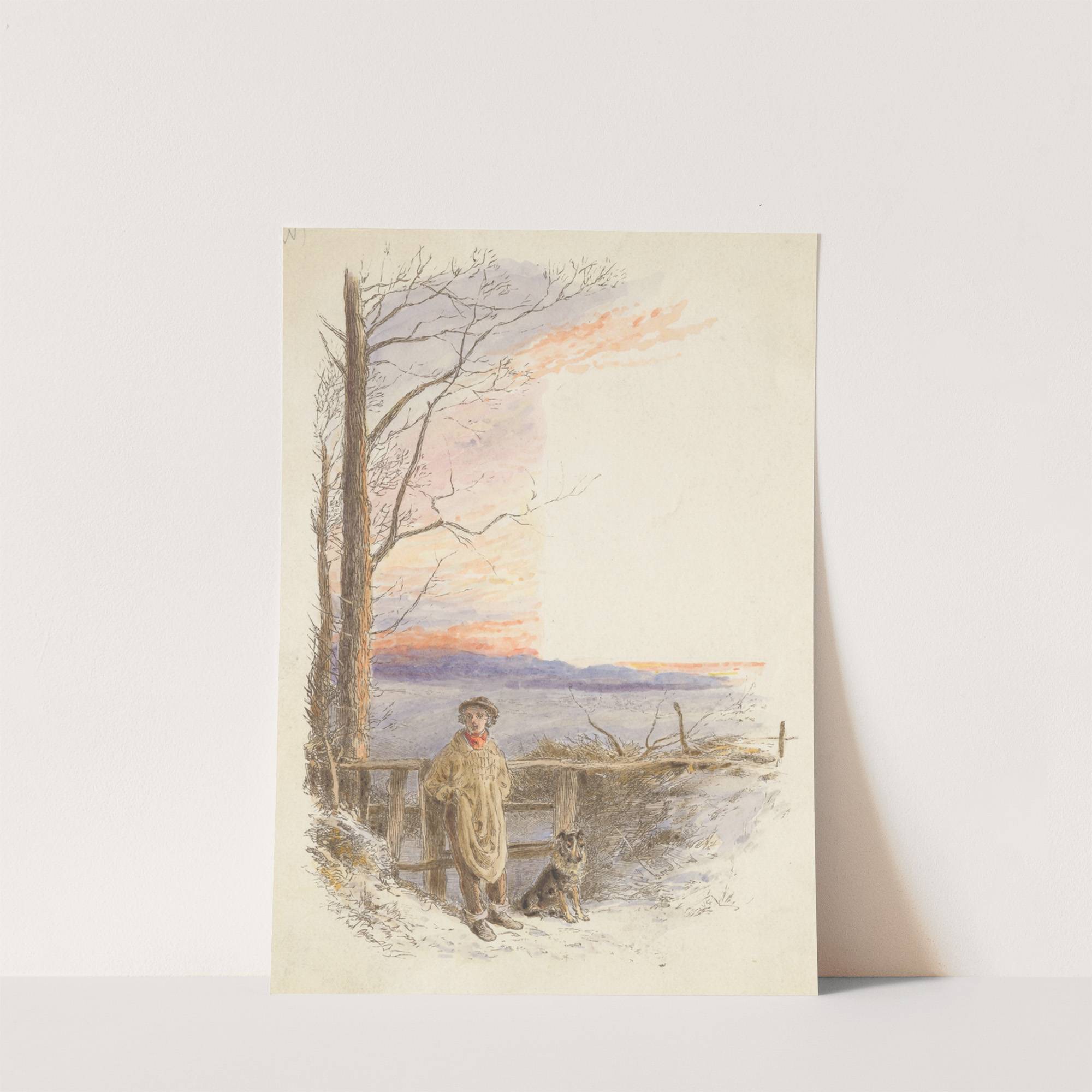This art print features "The Farmer's Boy" by Alfred W. Cooper, showcasing a serene winter scene with a rustic charm. The focal point is a young boy standing near a weathered wooden fence. He wears a beige overcoat and red...