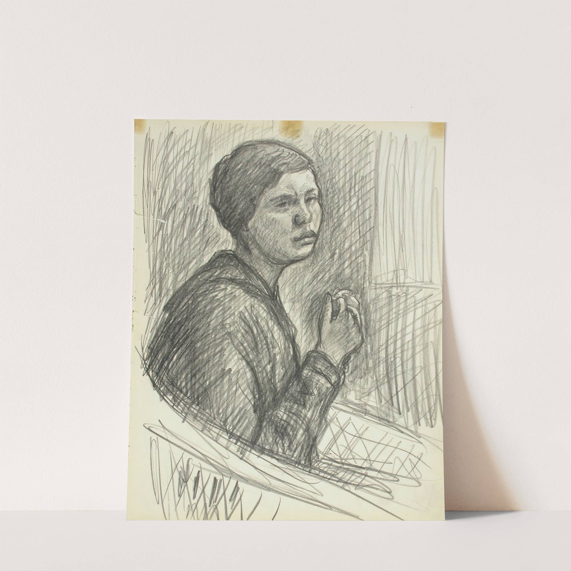 This striking black-and-white sketch captures the contemplative expression of a woman who gazes thoughtfully into the distance. The artist, Alfred William Finch, employs a pencil technique that brings out detailed textures in both her attire and background. Her hair is...