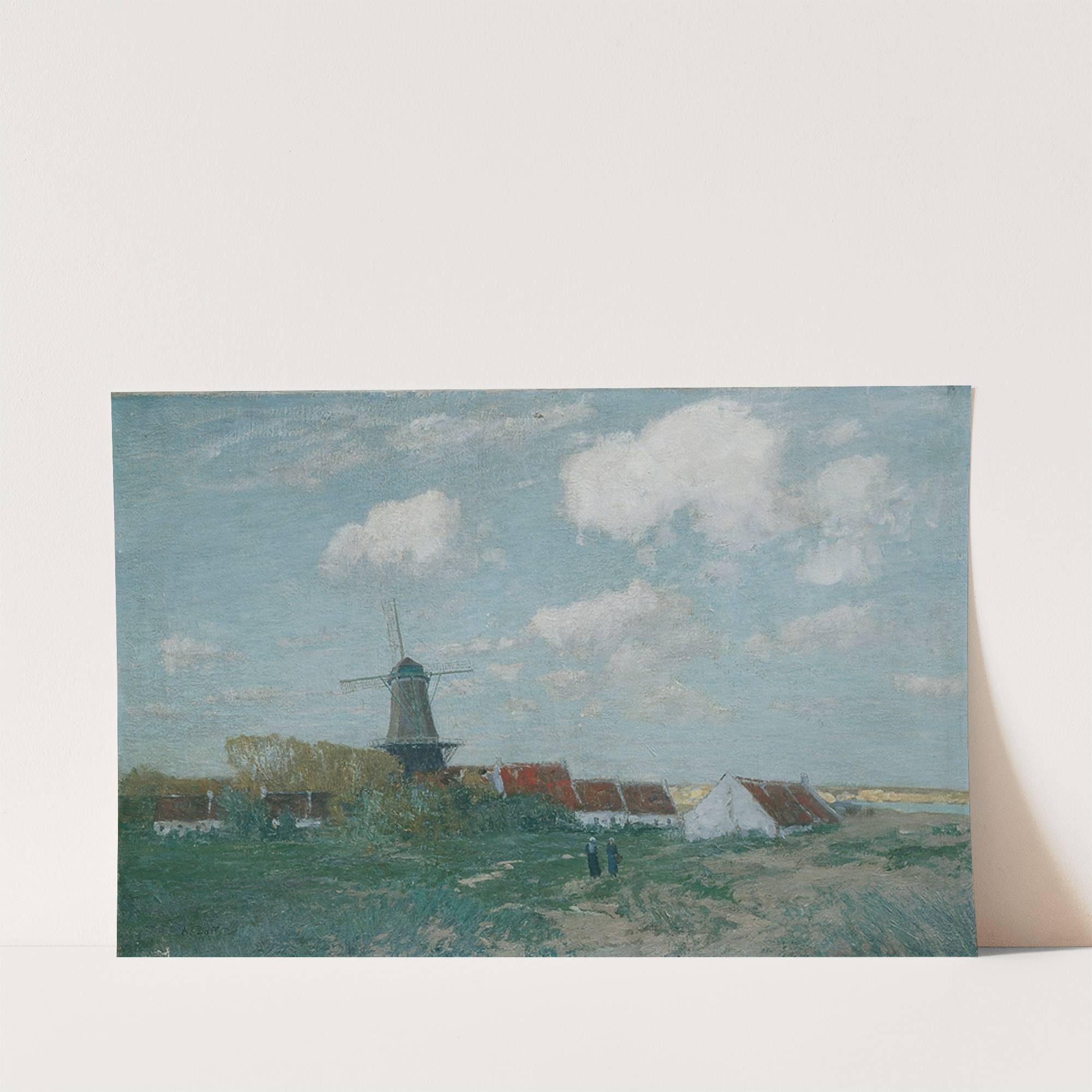 This vibrant painting captures the serene countryside scene of "Dorf auf der Düne" (Village on the Dune) by Alfred Zoff. The composition showcases a traditional Dutch windmill, prominently positioned slightly left of center, with its characteristic conical roof and weathered...