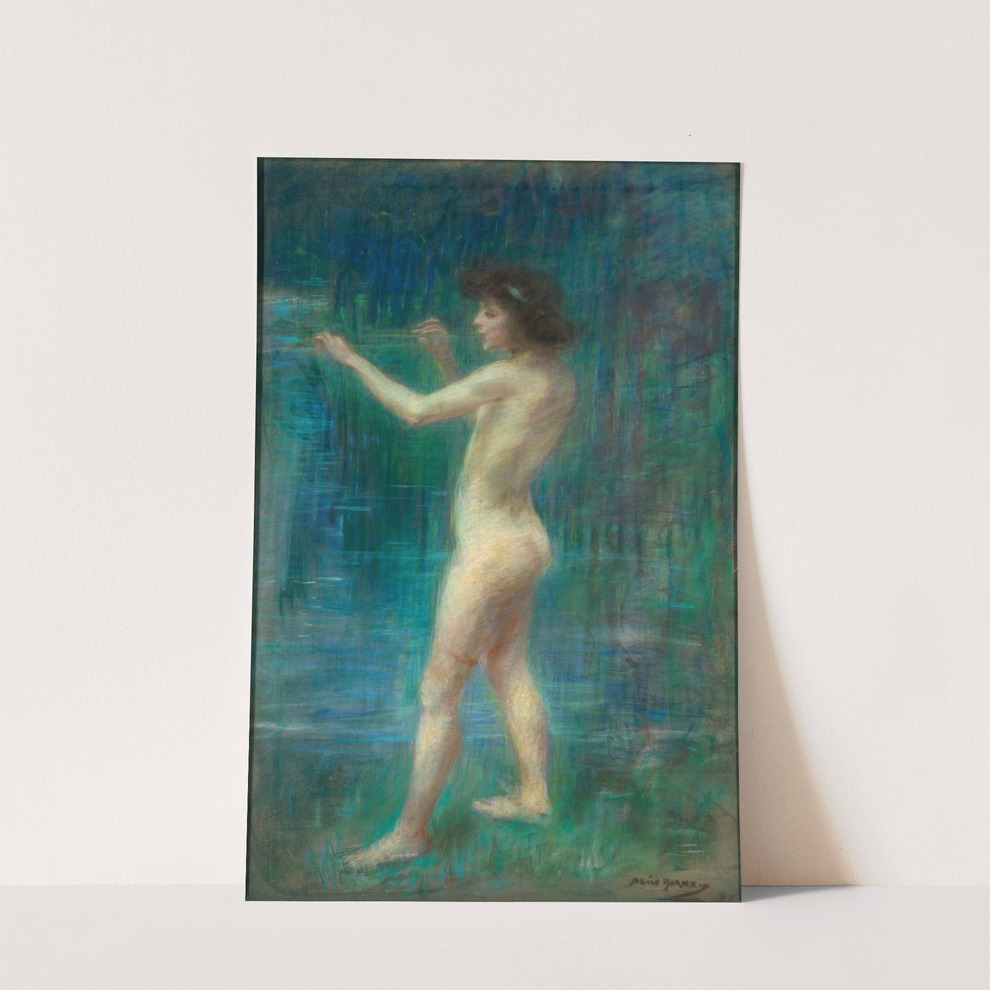 This art print features "Arcady" by Alice Pike Barney, a captivating impressionist painting of a nude woman in profile. The subject stands gracefully with her right arm extended forward and left arm slightly raised, creating an elegant and natural pose....