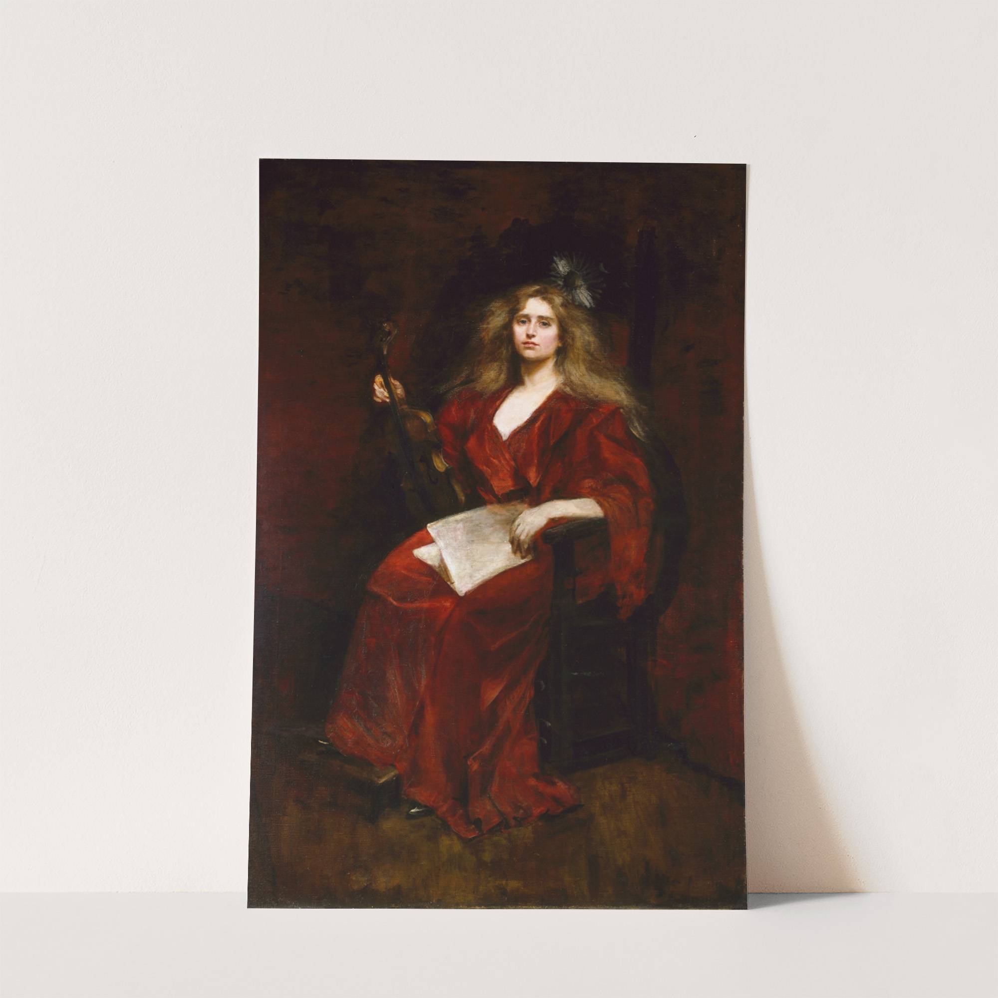 This exquisite art print features "Natalie with Violin" by the renowned artist Alice Pike Barney. Rendered in rich, deep tones of red and black, this portrait captures a regal, seated woman bathed in dramatic light. She is dressed in an...