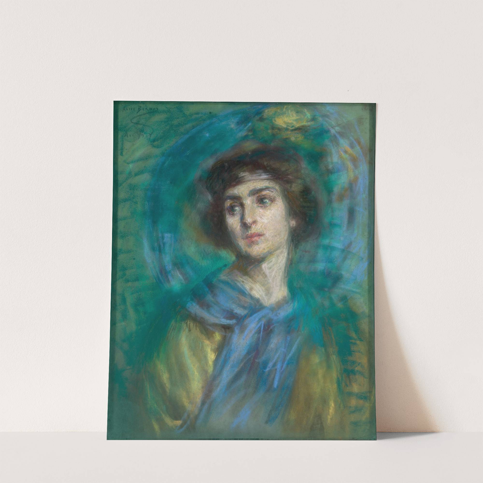 This captivating art print features "The Blue Scarf" by Alice Pike Barney, a vivid impressionistic portrait. Dominated by rich blue tones, the subject is a young woman with delicate, expressive facial features, including soft brown eyes and slightly parted pink...