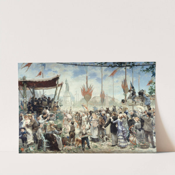 This stunning art print captures the lively scene of the July 14th celebration, a vibrant depiction of an outdoor gathering in the late 19th century. Painted with rich, textured brushstrokes and a soft color palette, the artwork brings to life...