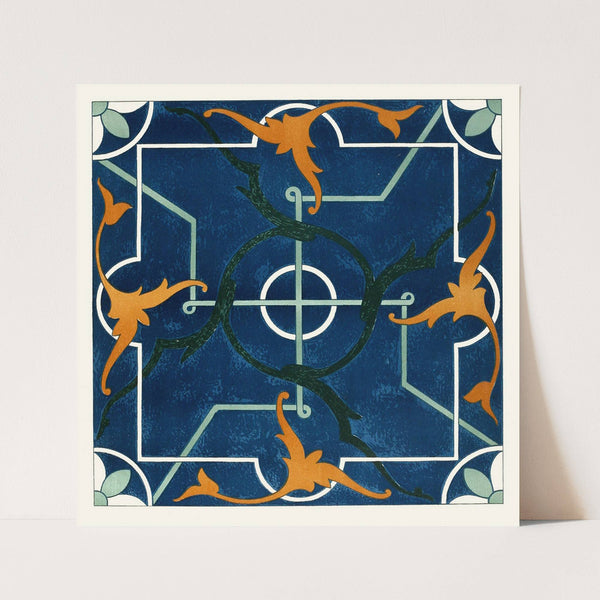 This vibrant artwork features an intricate tile design inspired by traditional Afghani motifs. The composition showcases four large, overlapping floral shapes in deep navy blue, each adorned with a bright orange flower at their center. These flowers are connected by...