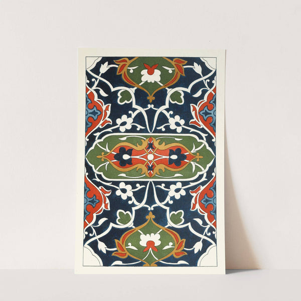 This vibrant art print features "Plate 17" from the Afghan Boundary Commission collection, showcasing an intricate and colorful design that exudes traditional cultural flair. The dominant colors include bold navy blue, bright red, lively green, warm white, and subtle orange,...