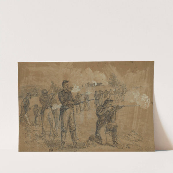 This art print depicts "1st Maine Cavalry Skirmishing" by Alfred Rudolph Waud, rendered in monochromatic pencil and ink on brown paper. The scene captures a moment from the Civil War battlefield with a group of Union cavalry soldiers engaged in...