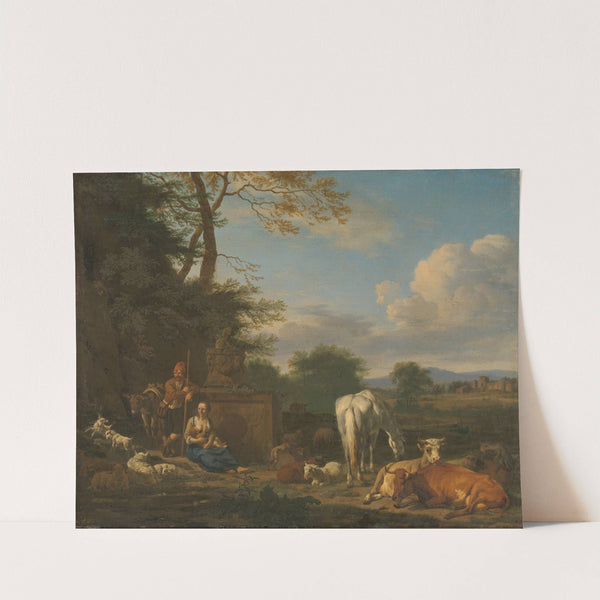 Discover "Arcadian Landscape with Resting Shepherds and Animals" by Adriaen van de Velde, a captivating painting that transports you to a serene pastoral scene. The artwork features a peaceful countryside landscape bathed in soft sunlight, with lush greenery, towering trees,...