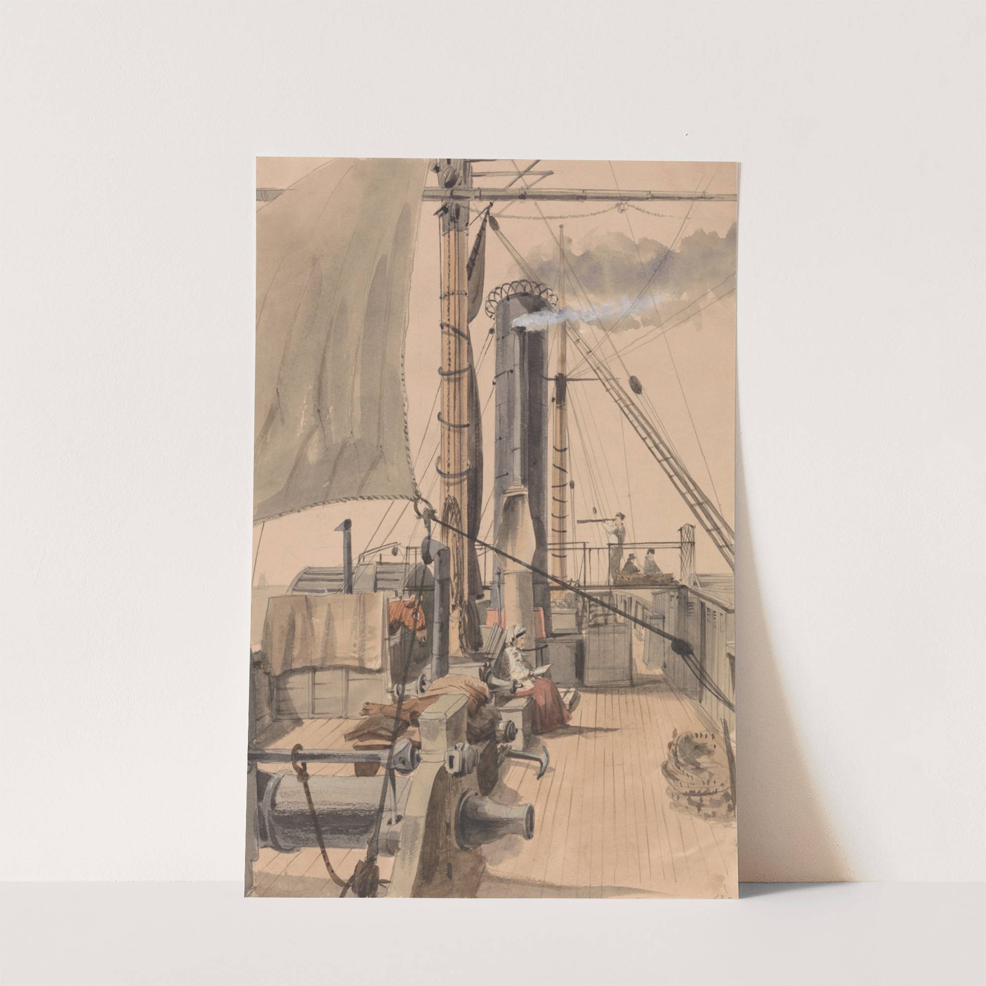 This watercolor painting titled "Deck of a Paddle Steamer" by Allen Edward Everitt offers a captivating glimpse into the nostalgic world of maritime history. The scene captures the detailed, bustling deck of an old-fashioned paddle steamer ship, expertly illustrated in...