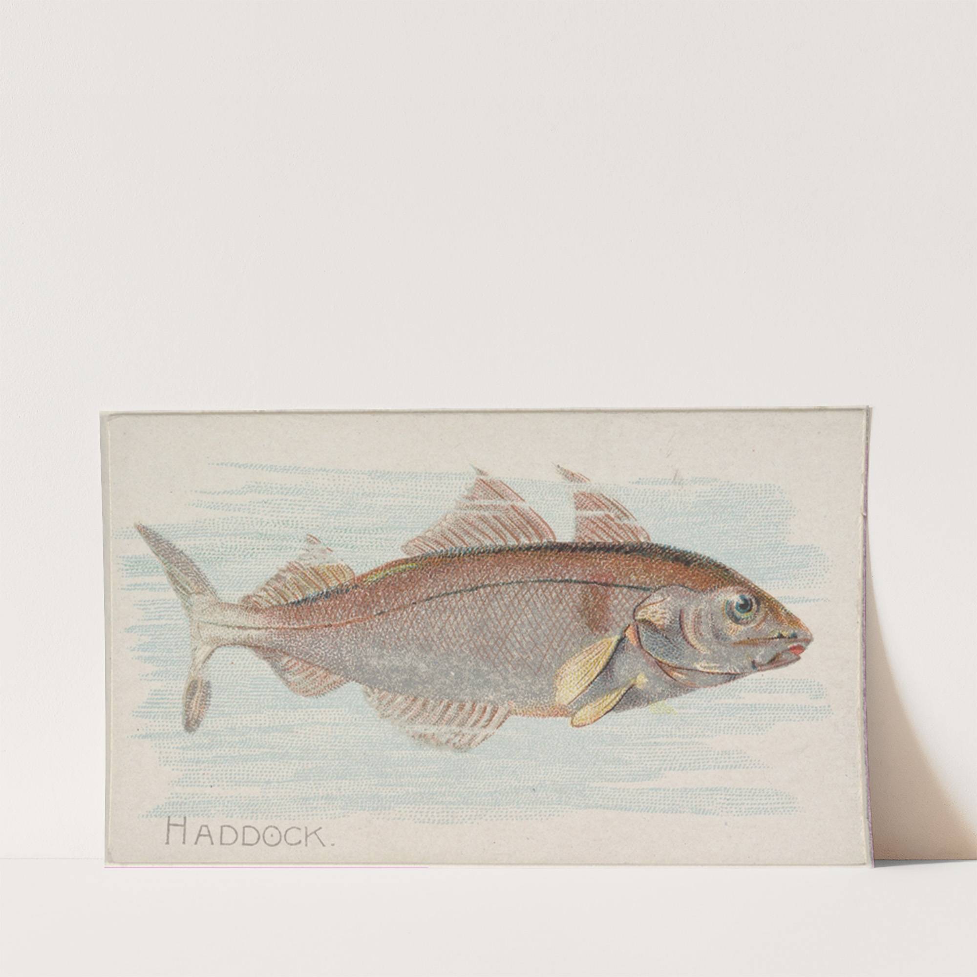 This exquisite art print features a detailed illustration of a Hadlock fish, rendered in a realistic style by the artist known as Allen & Ginter, circa 1889. The fish is depicted in a lifelike profile view, showcasing its delicate scales,...