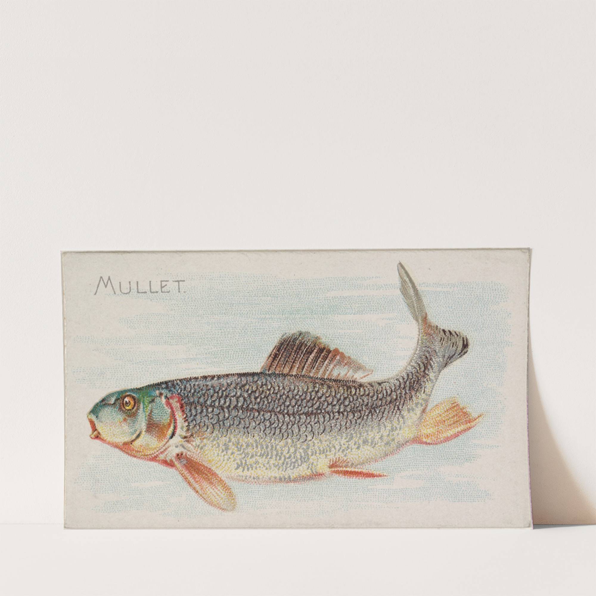This art print features a meticulously detailed illustration of a mullet fish, created in a traditional botanical style that emphasizes natural realism. The mullet is depicted in exquisite detail, showcasing its metallic blue-silver scales, which are carefully rendered to capture...