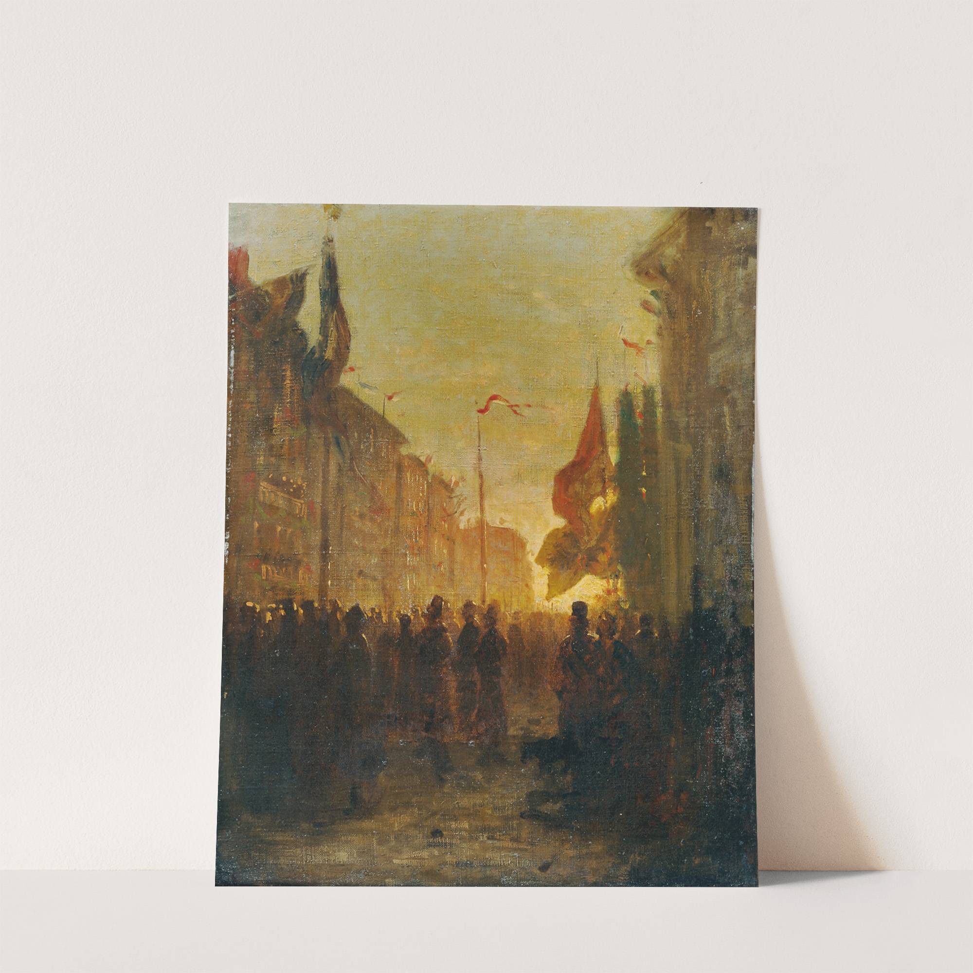 This dynamic oil painting titled "Festbeflaggung" by Alois Schön captures the essence of a vibrant yet somber street scene during sunset. The artist uses rich, warm tones of yellow, orange, and brown to depict the setting sun that casts a...
