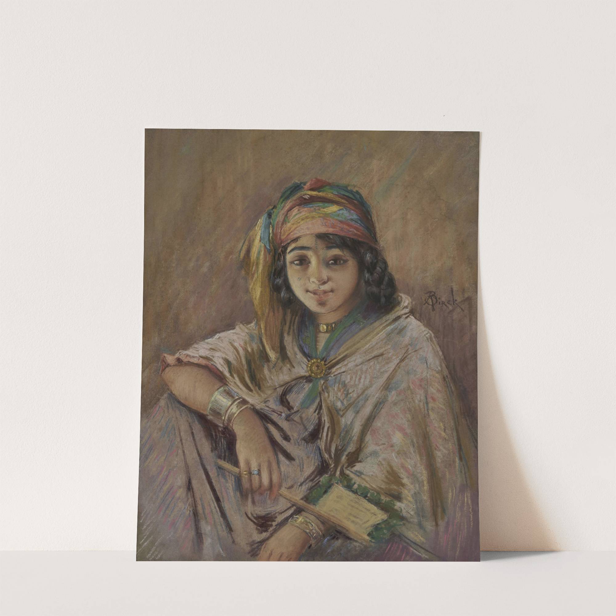 This striking art print showcases "Jeune berbère" by Alphonse Birck, a masterful example of early 20th-century portraiture. The subject is a young Berber woman, depicted in richly textured hues with meticulous attention to detail. Her dark, wavy hair is partially...