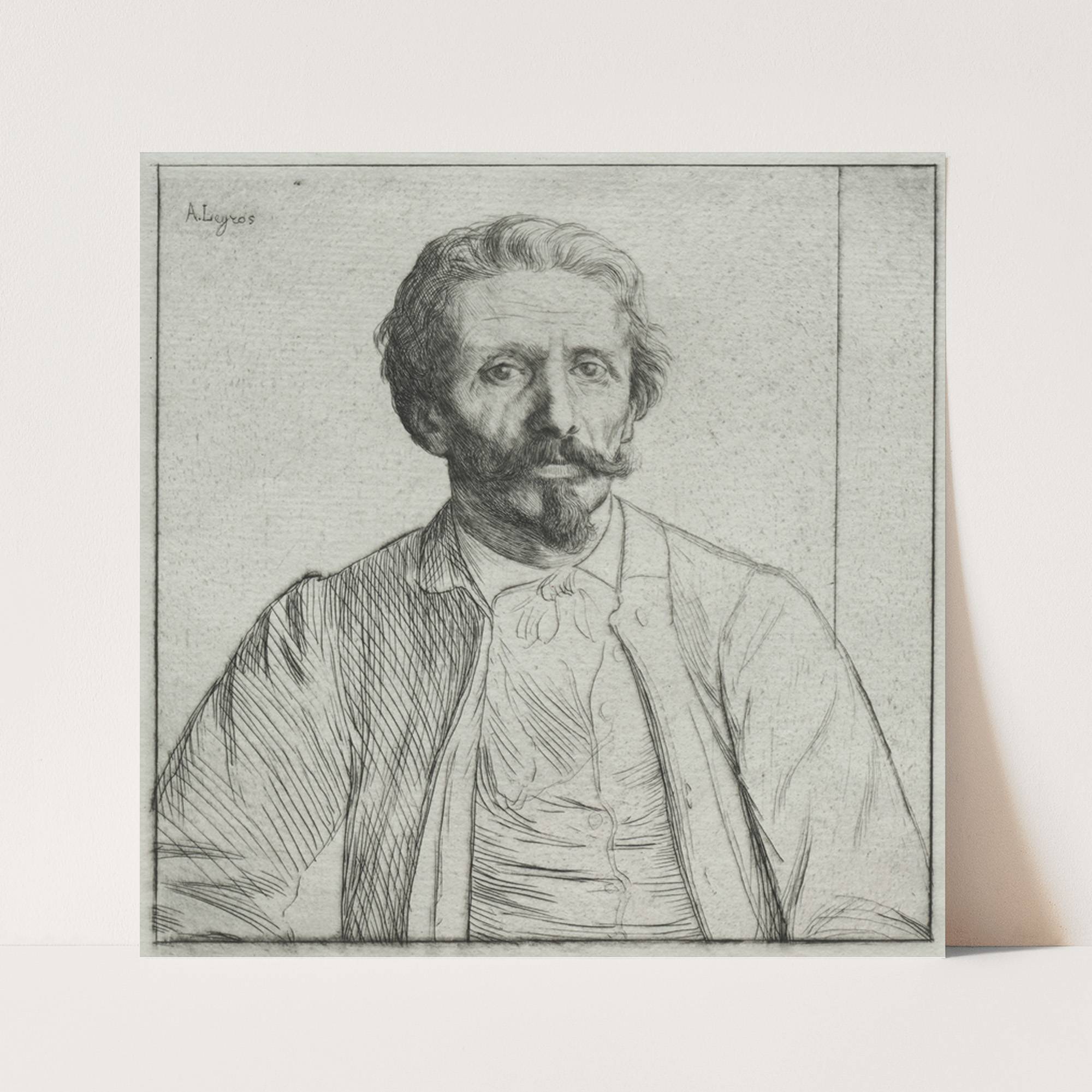 This is a finely detailed black and white pencil drawing of a distinguished man by the artist Auguste Delâtre, circa 1877. The subject is portrayed from the chest up, with meticulous attention to detail in his facial features and clothing....