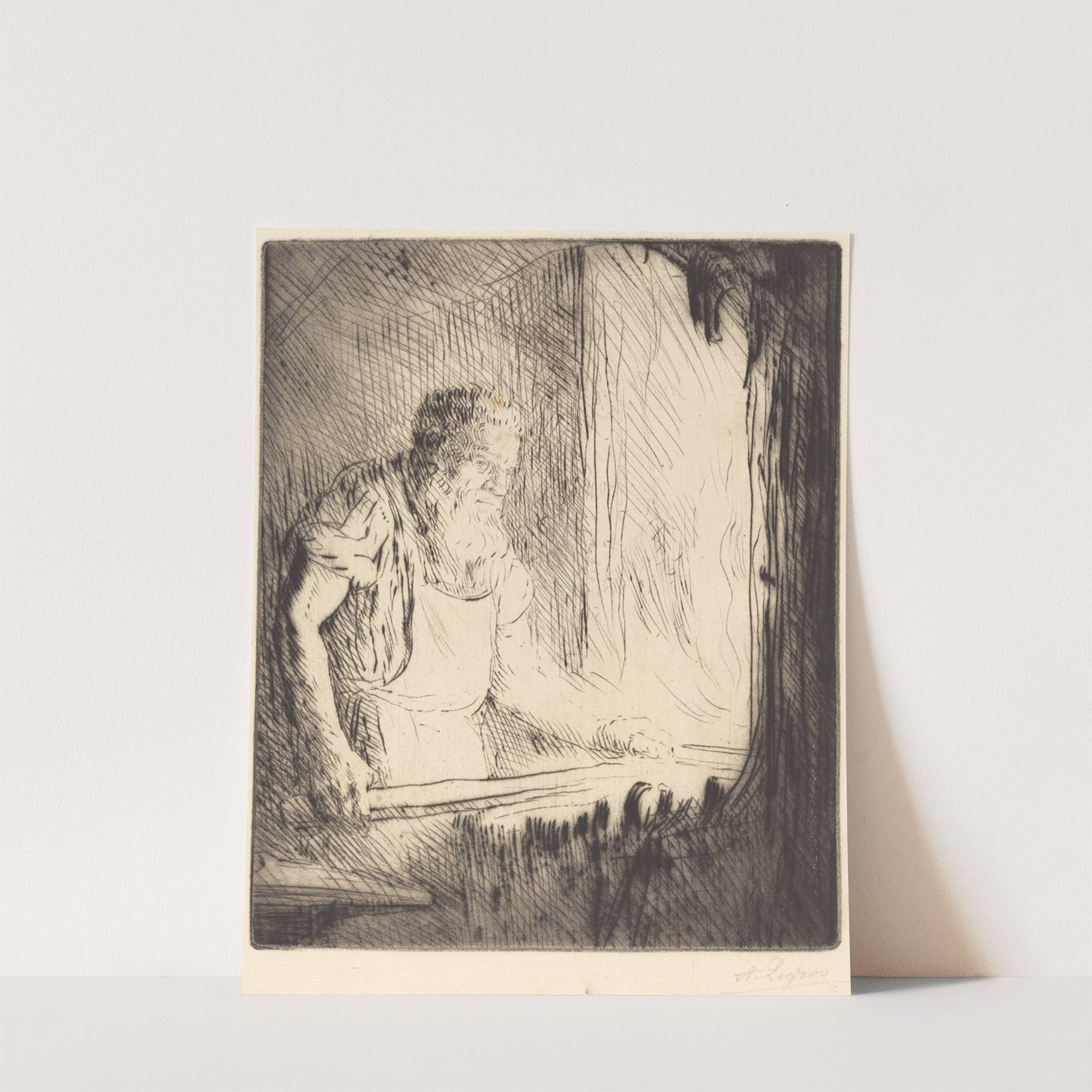 This striking black-and-white etching by Alphonse Legros titled "Blacksmith" is a masterful depiction of traditional craftsmanship. The artist employs fine, cross-hatched lines to create a dynamic sense of movement and depth. A muscular male figure, partially obscured by shadow, bends...