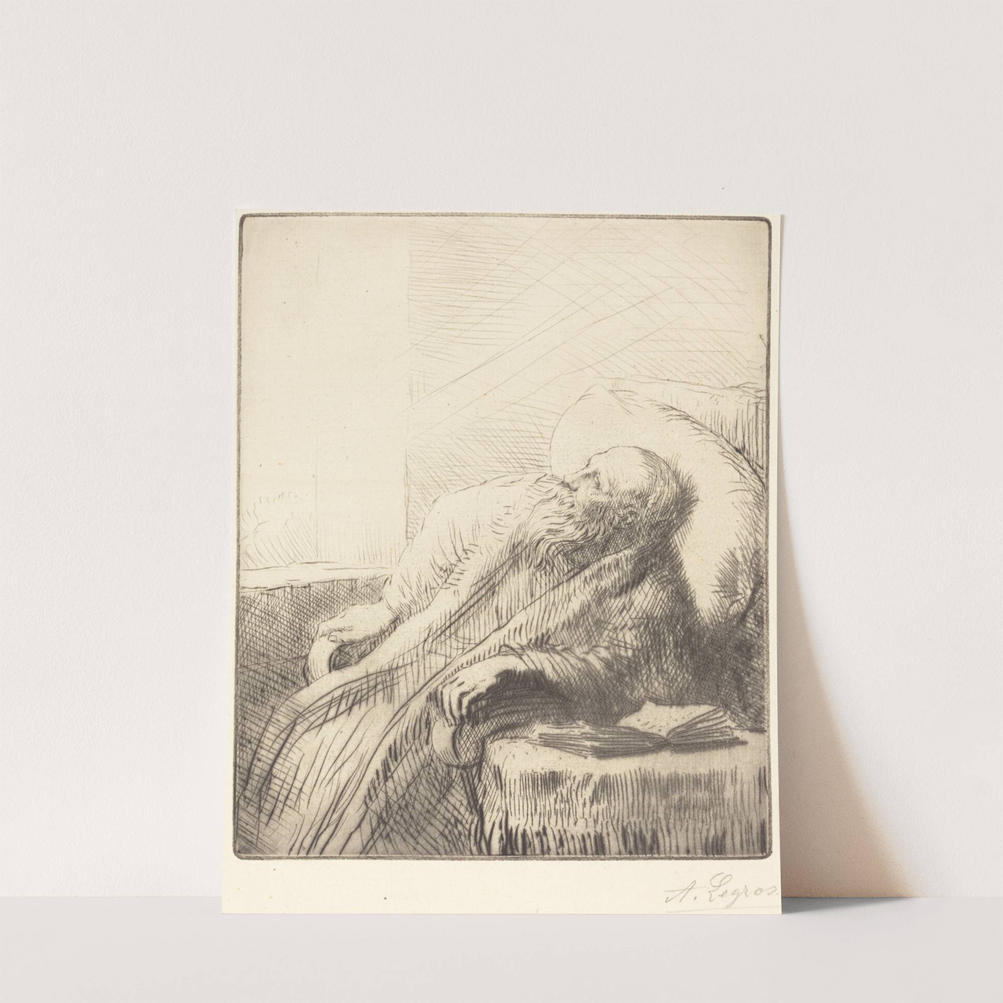 This art print features "Convalescent" by Alphonse Legros, rendered in an expressive black-and-white line drawing style. The subject of the piece is a reclining figure with a somewhat hunched posture, evoking a sense of vulnerability and introspection. The figure's face...