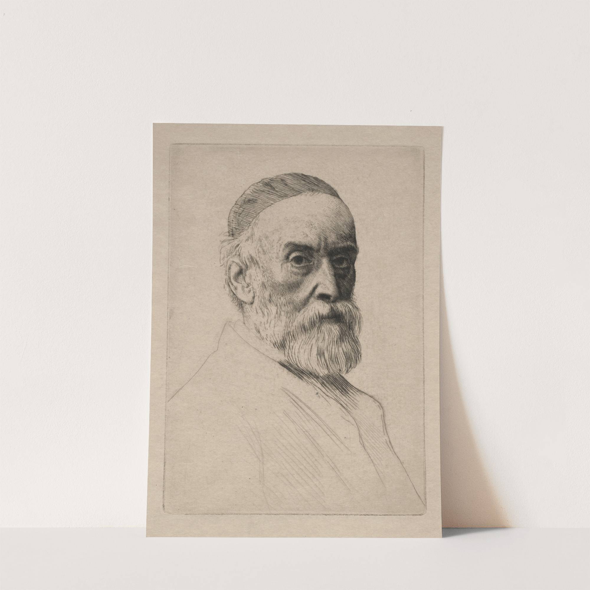 This monochromatic etching portrays a dignified elderly man with a contemplative expression. The artist has meticulously rendered the details of his weathered face, including deep-set eyes that convey wisdom and introspection, a prominent nose, and a full beard with individual...