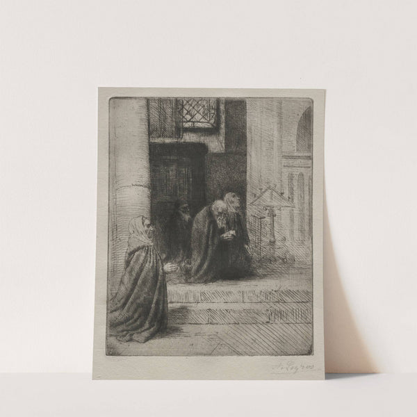 This artwork is a detailed black-and-white etching titled "Interior of a Church" by Alphonse Legros, created in the late 19th century. The scene depicts two figures within the shadowed entrance of an ancient church. On the left, a figure adorned...