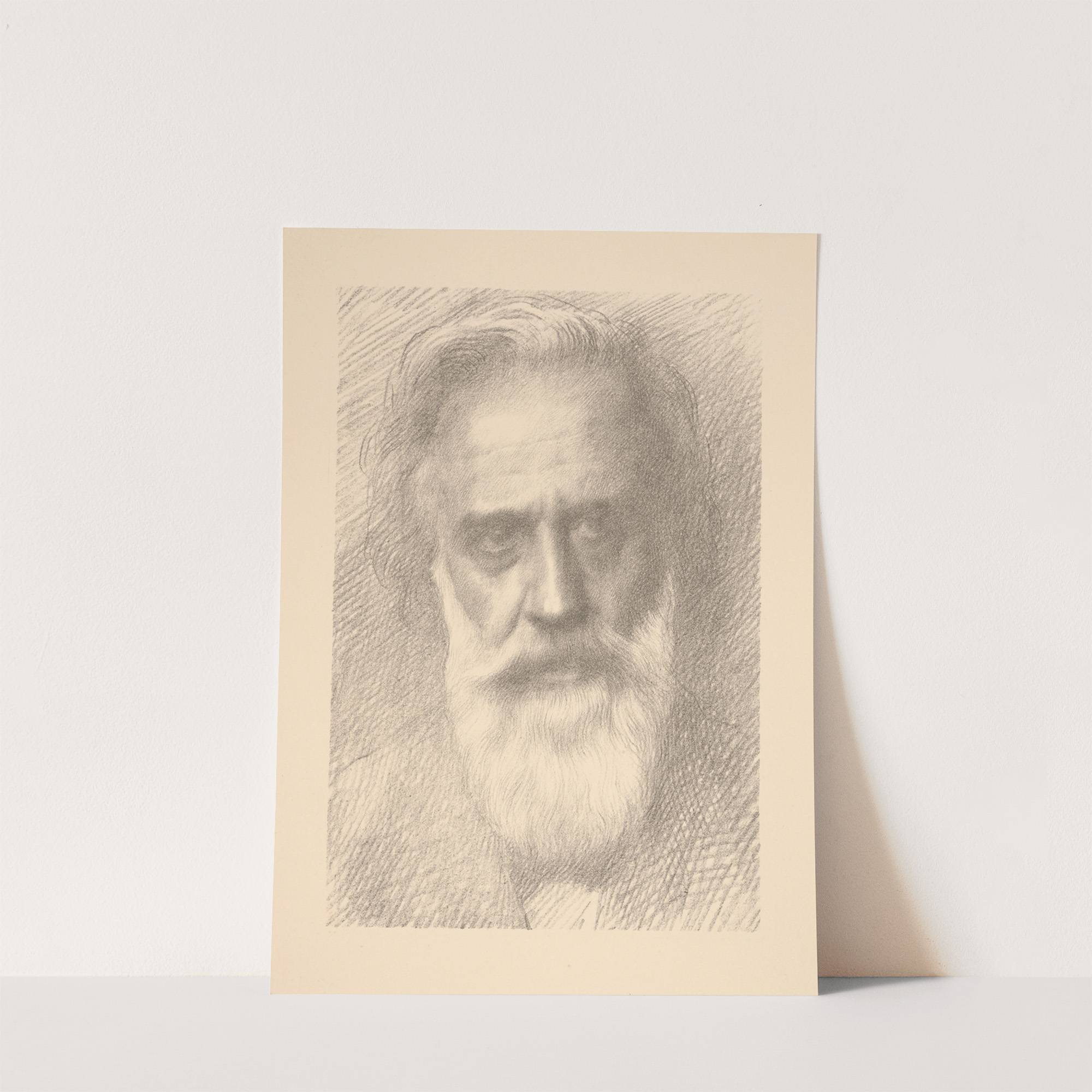 This striking black-and-white pencil drawing features a detailed self-portrait created by the artist Alphonse Legros in 1898. The portrait showcases an intense, contemplative expression on the face of an older man with a prominent, well-groomed white beard and slightly disheveled...