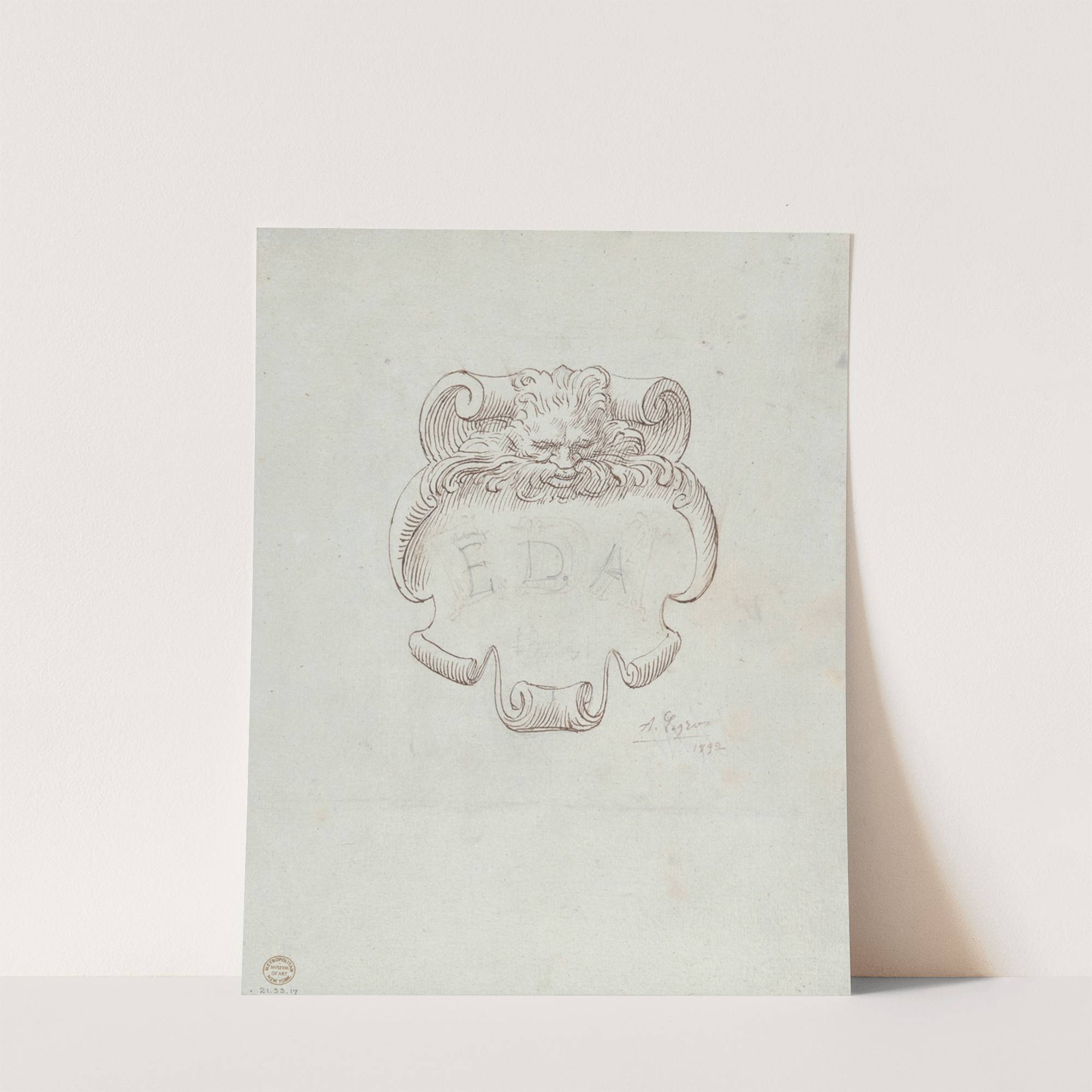 This art print features a detailed, monochromatic pencil sketch of an elaborate frame design centered around the name "EDWARD D. ADAMS." The intricate frame is adorned with swirling patterns and curls that give it a baroque feel, while a small,...