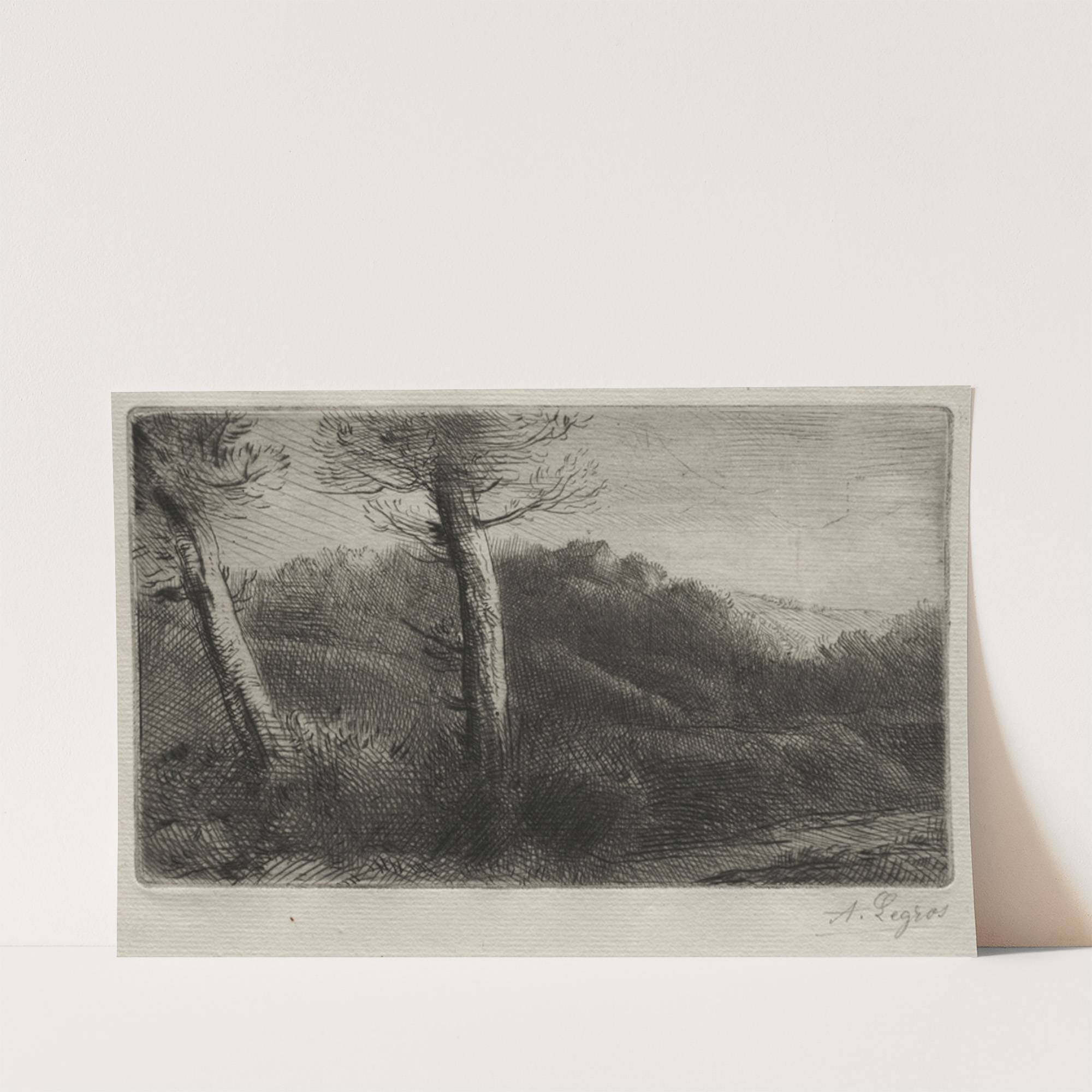 Experience the serene beauty of nature with this exquisite black-and-white etching titled "Sunset" by renowned artist Alphonse Legros. The artwork features a tranquil forest landscape, masterfully captured in fine linework and cross-hatching that creates a rich texture and depth. Two...