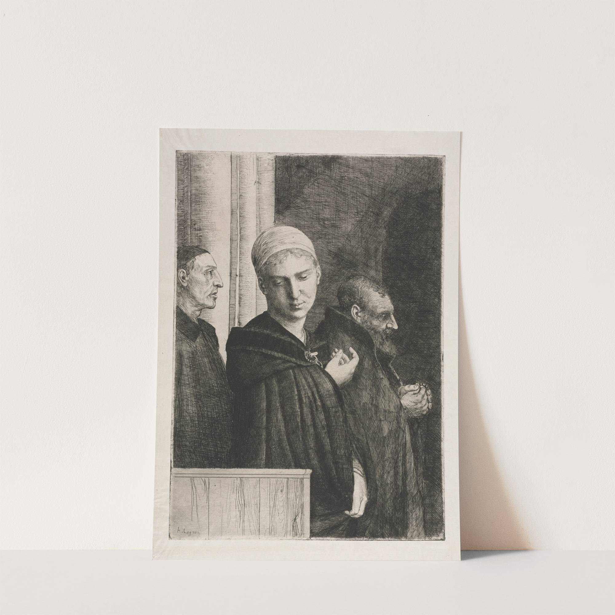 This stunning black-and-white etching by Alphonse Legros titled "The Baptism" captures the solemn atmosphere of a religious ceremony. At its center, a young woman with fair skin and delicate features is depicted with her eyes cast downward in contemplation. She...