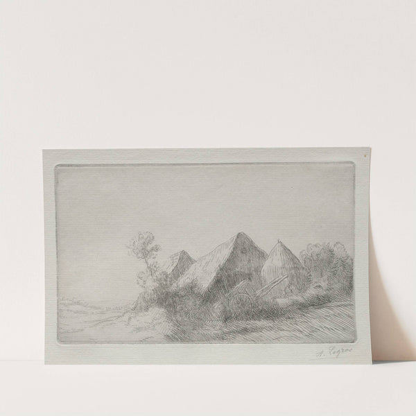 This exquisite black-and-white etching showcases a serene rural landscape titled "The Cart Shed" by Alphonse Legros. The piece captures three conical thatched-roof huts nestled among trees, evoking a peaceful countryside scene. Delicate cross-hatching techniques create textured shading and depth, bringing...