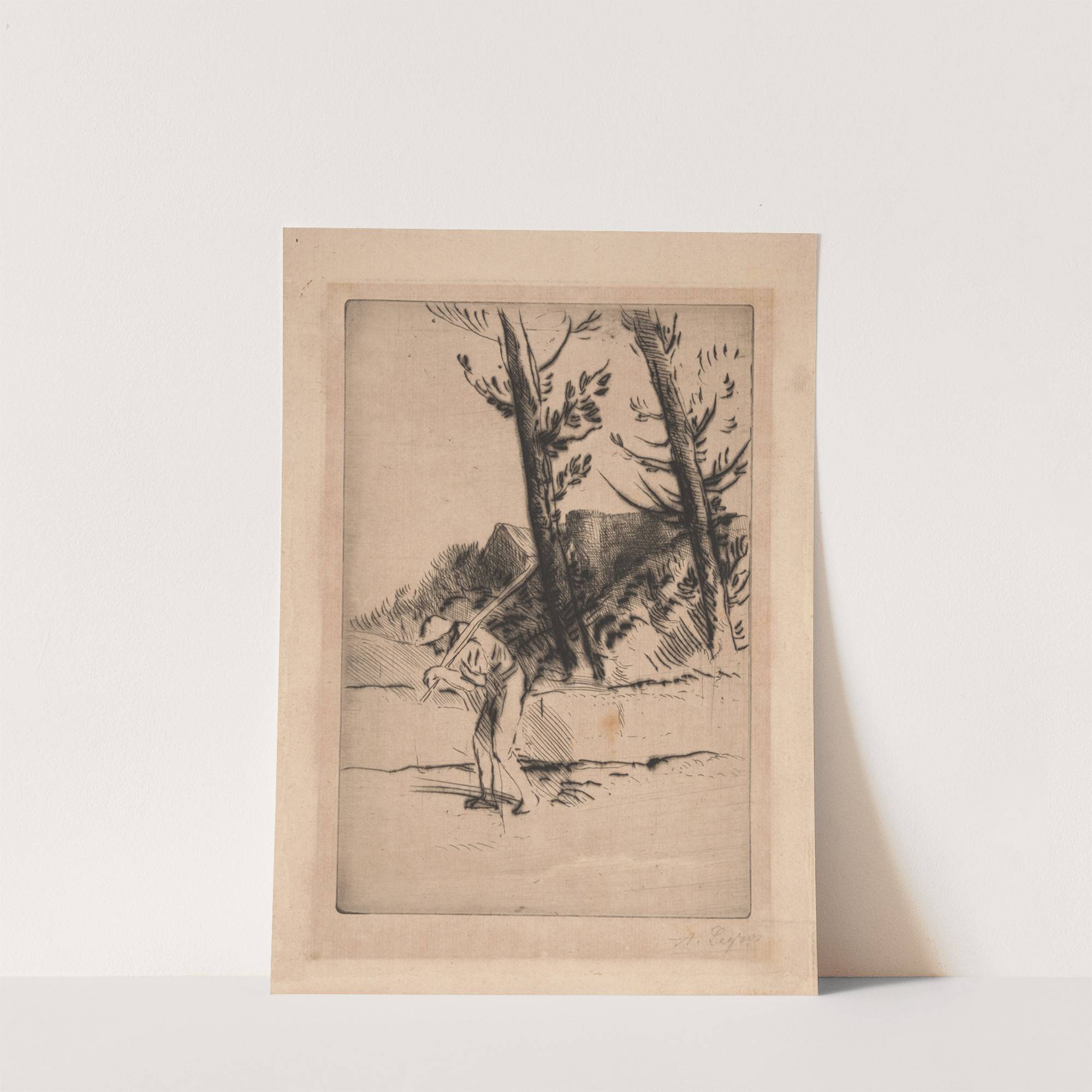 This black-and-white etching showcases a solitary deer gracefully navigating a forested landscape. The artist, Alphonse Legros, masterfully uses fine lines and cross-hatching techniques to create depth and texture. The deer is depicted in mid-stride, its head lowered and ears slightly...