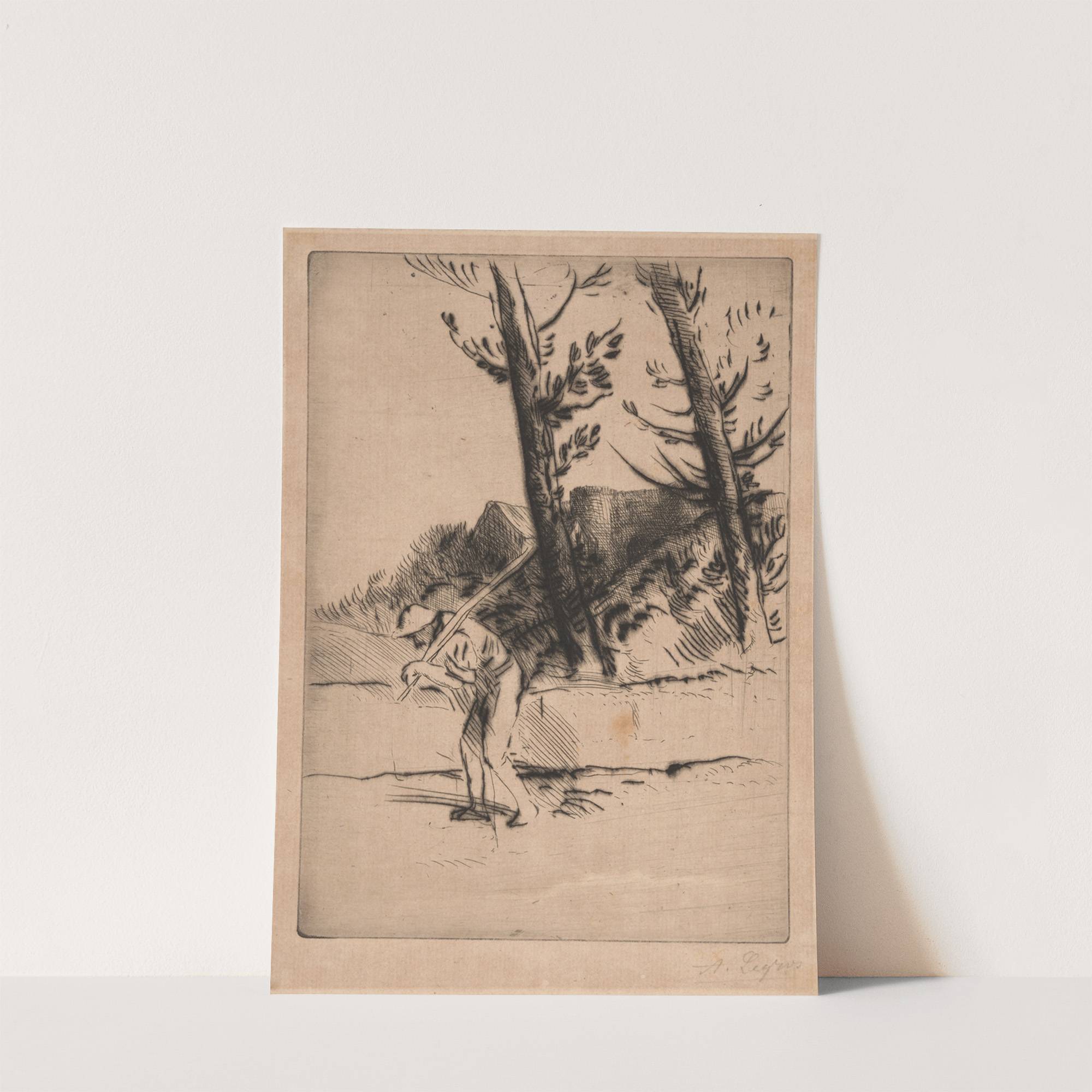 This black-and-white etching titled "Traveler with Pole Over Shoulder" is a captivating piece of art created by Alphonse Legros. The artist masterfully uses fine, precise lines to depict a solitary traveler walking through a rugged forest landscape. The traveler, positioned...