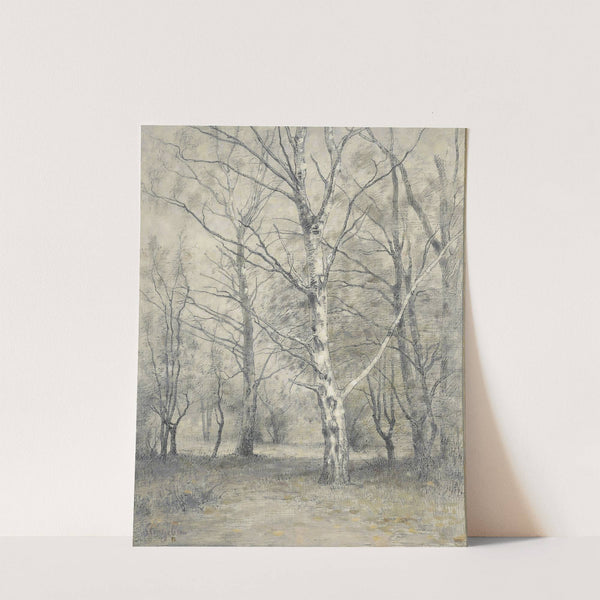 This beautiful print captures the serene beauty of a forest in winter, rendered by the skilled artist Alphonse Stengelin. The artwork employs soft, delicate tones of white, gray, and muted blue to depict bare birch trees standing tall against a...