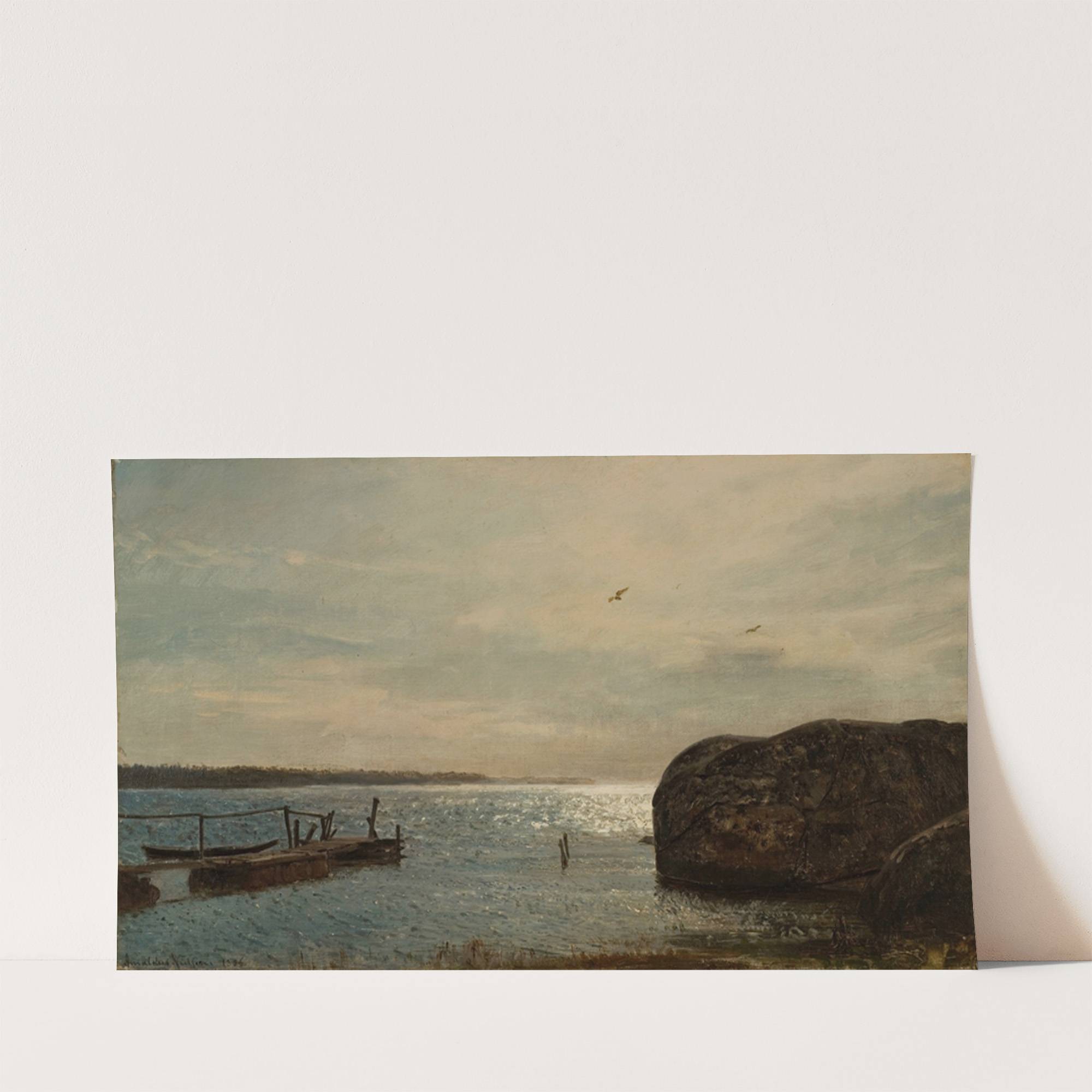 This evocative landscape print features "Brygge, Hvaler (1886)" by Amundus Nielsen, showcasing a serene maritime scene rendered in a timeless impressionist style. The palette is dominated by soft blues and gentle warm tones that capture the calm of a sunset...
