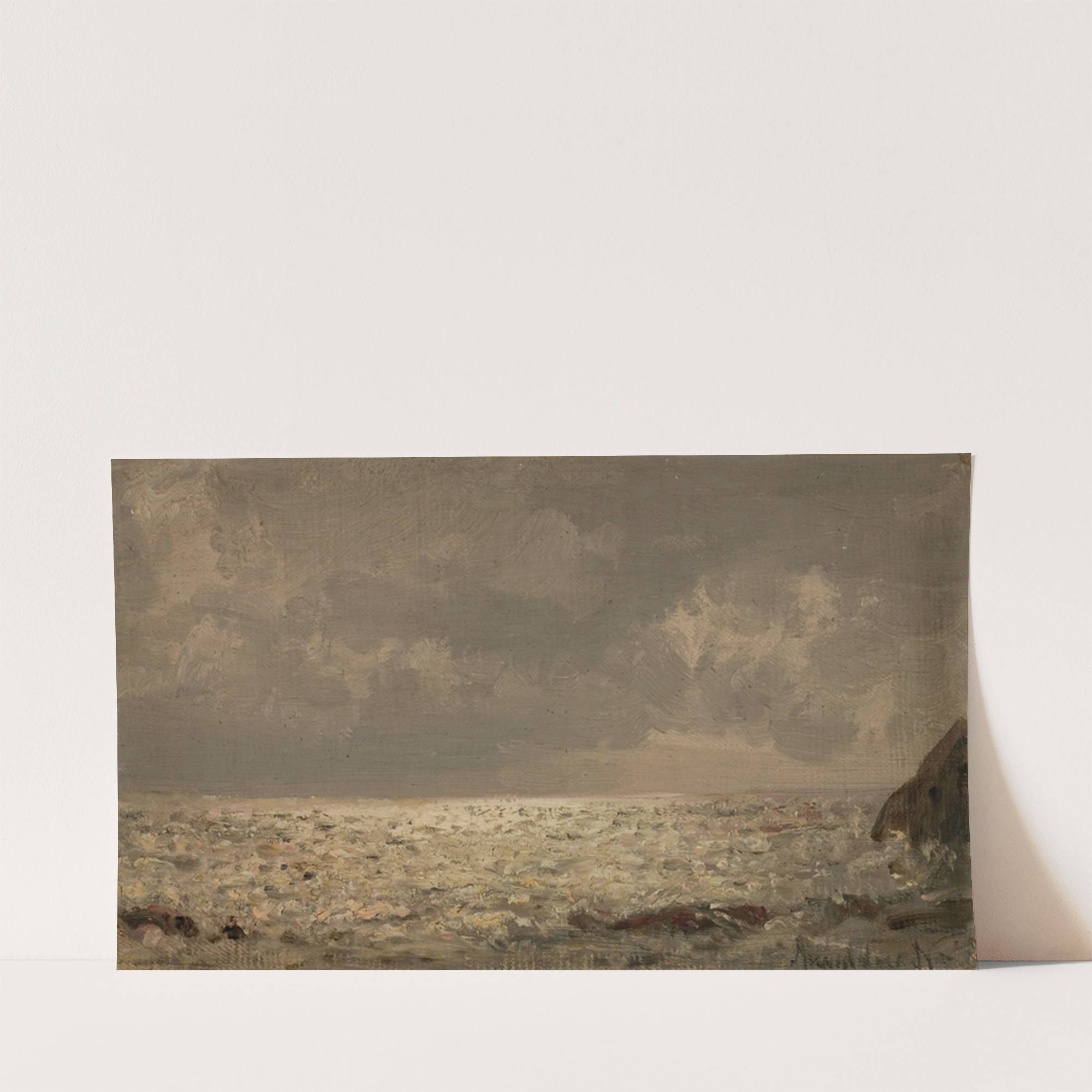 This artwork is a captivating impressionist painting titled "Drivende Skyer" by the renowned artist Amaldus Nielsen. The piece captures a tranquil yet dynamic seascape under an overcast sky. Soft, muted tones of gray and beige dominate the upper portion of...