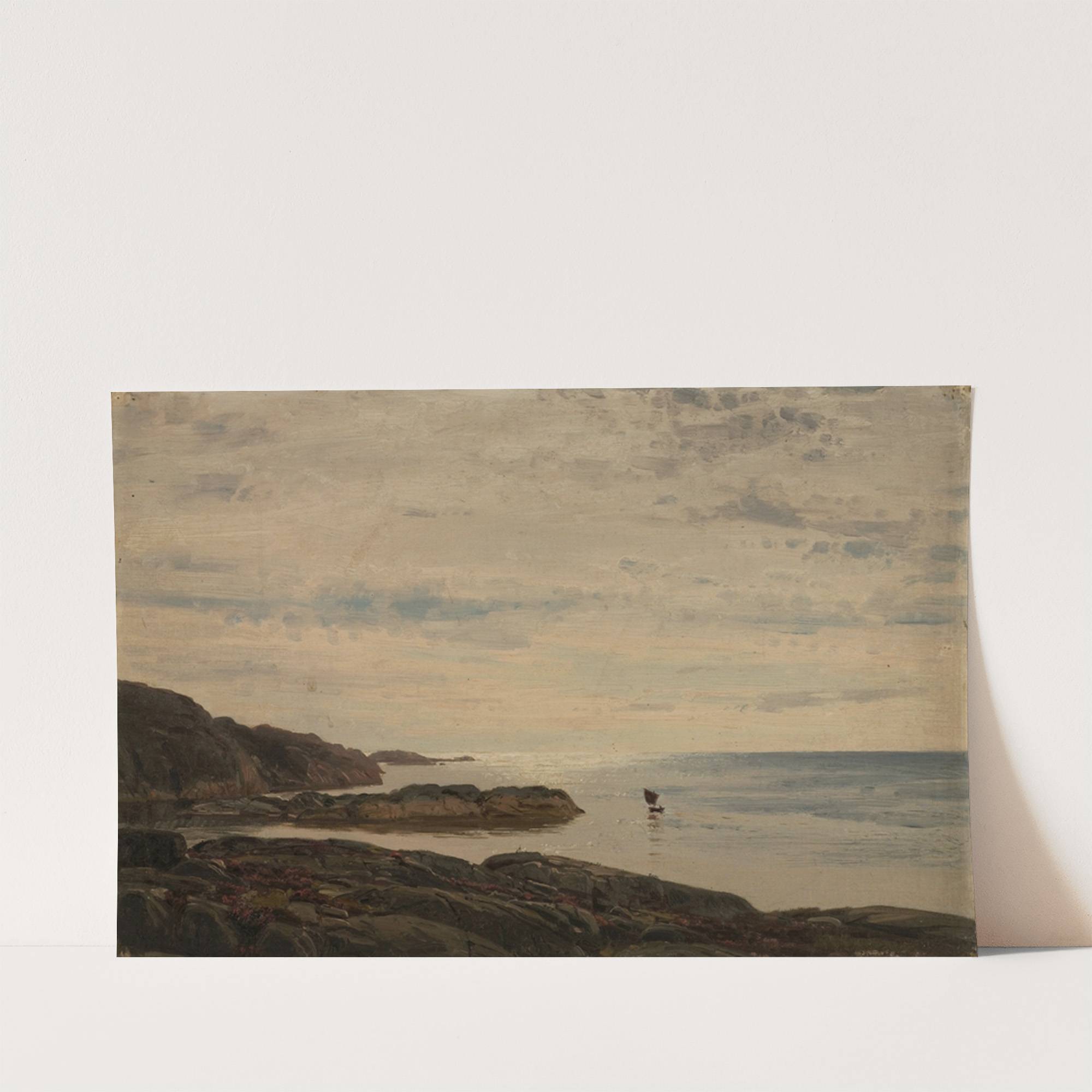 This artwork, titled "En Holme" by Amaladus Nielsen, captures a serene coastal scene at sunset. The painting features a tranquil seascape with gentle waves reflecting the soft hues of the setting sun. The sky is filled with a blend of...