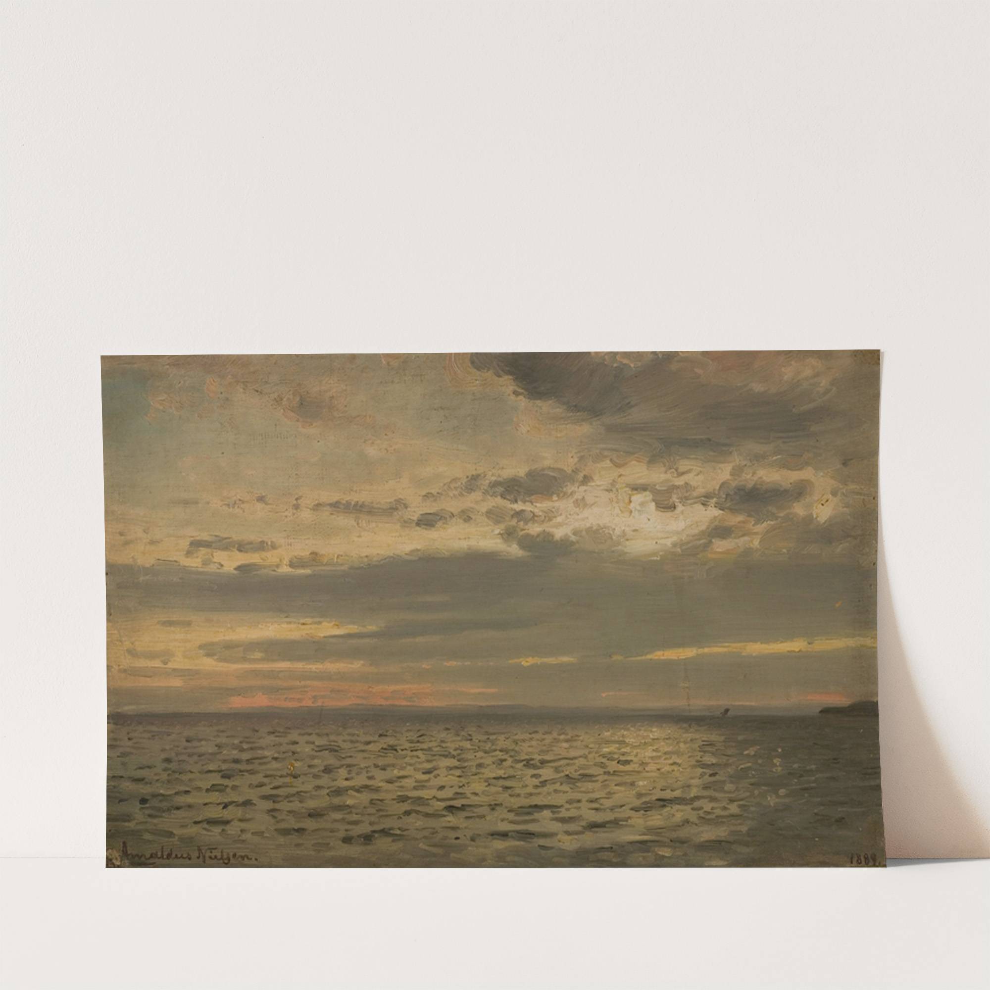 This artwork, titled "Ettermiddagsstemning" (Morning Calm) by Amaladus Nielsen, showcases a breathtaking coastal sunset scene in oil on canvas. The painting features a richly textured sky filled with dramatic clouds, ranging from soft greens and yellows to deep browns and...