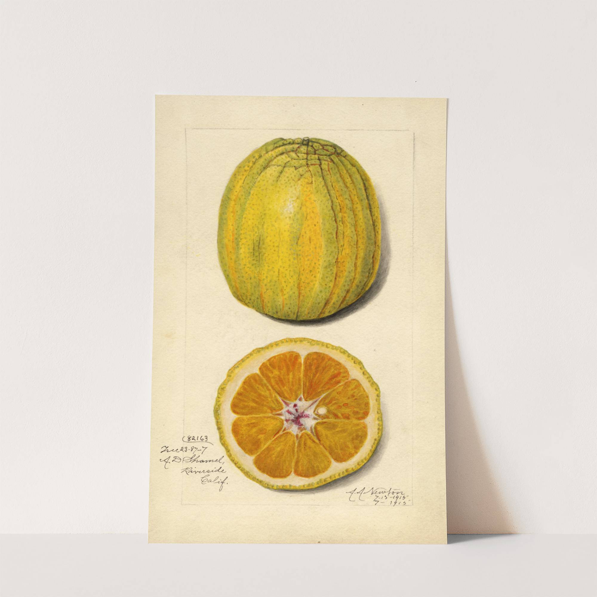 Discover the vibrant charm of nature through "Citrus sinensis" by Amanda Almira Newton. This captivating art print showcases a beautifully detailed, hand-painted depiction of a yellow-green citrus fruit, both whole and halved. The whole fruit sits at the top, displaying...