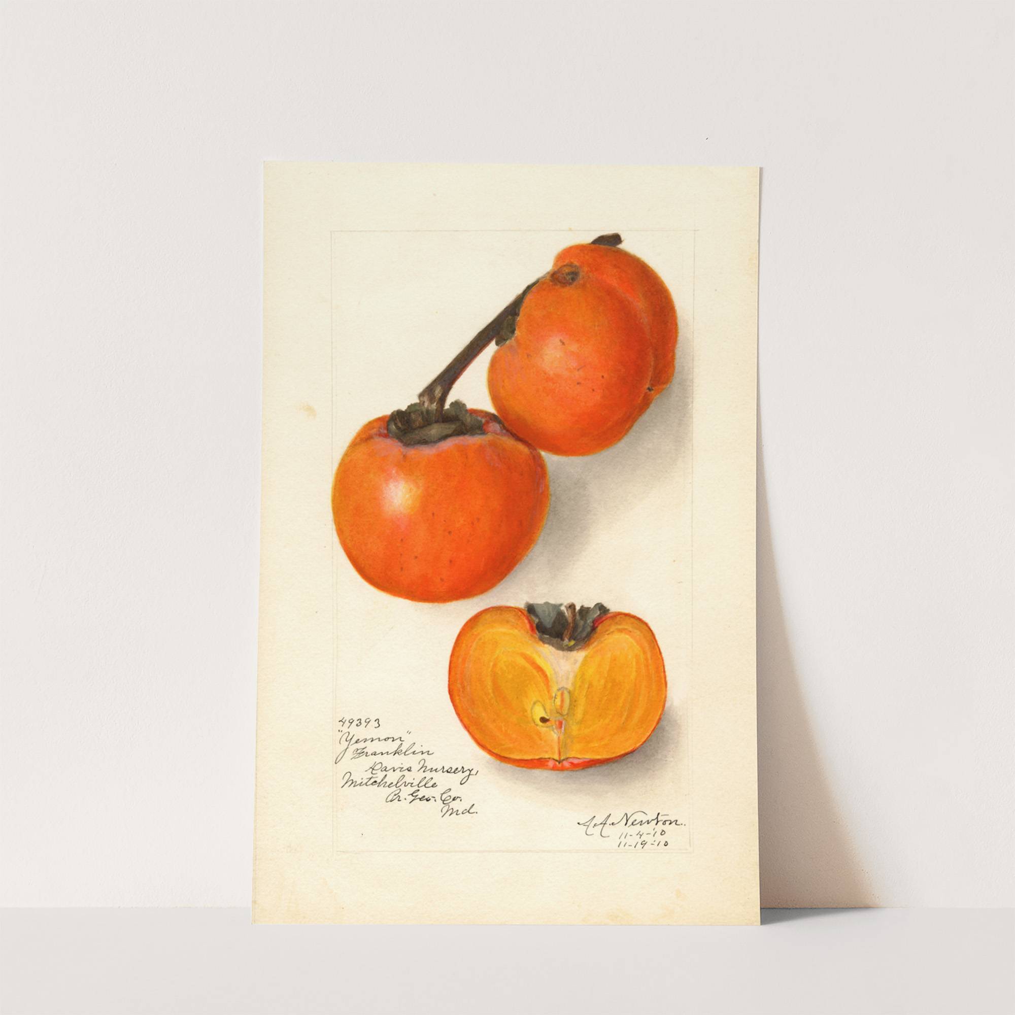 This vibrant print features three bright orange persimmons against a stark white background. Two whole fruits are positioned at the top of the composition, displaying their round, smooth surfaces with small brown stems attached. Below them is one open persimmon,...