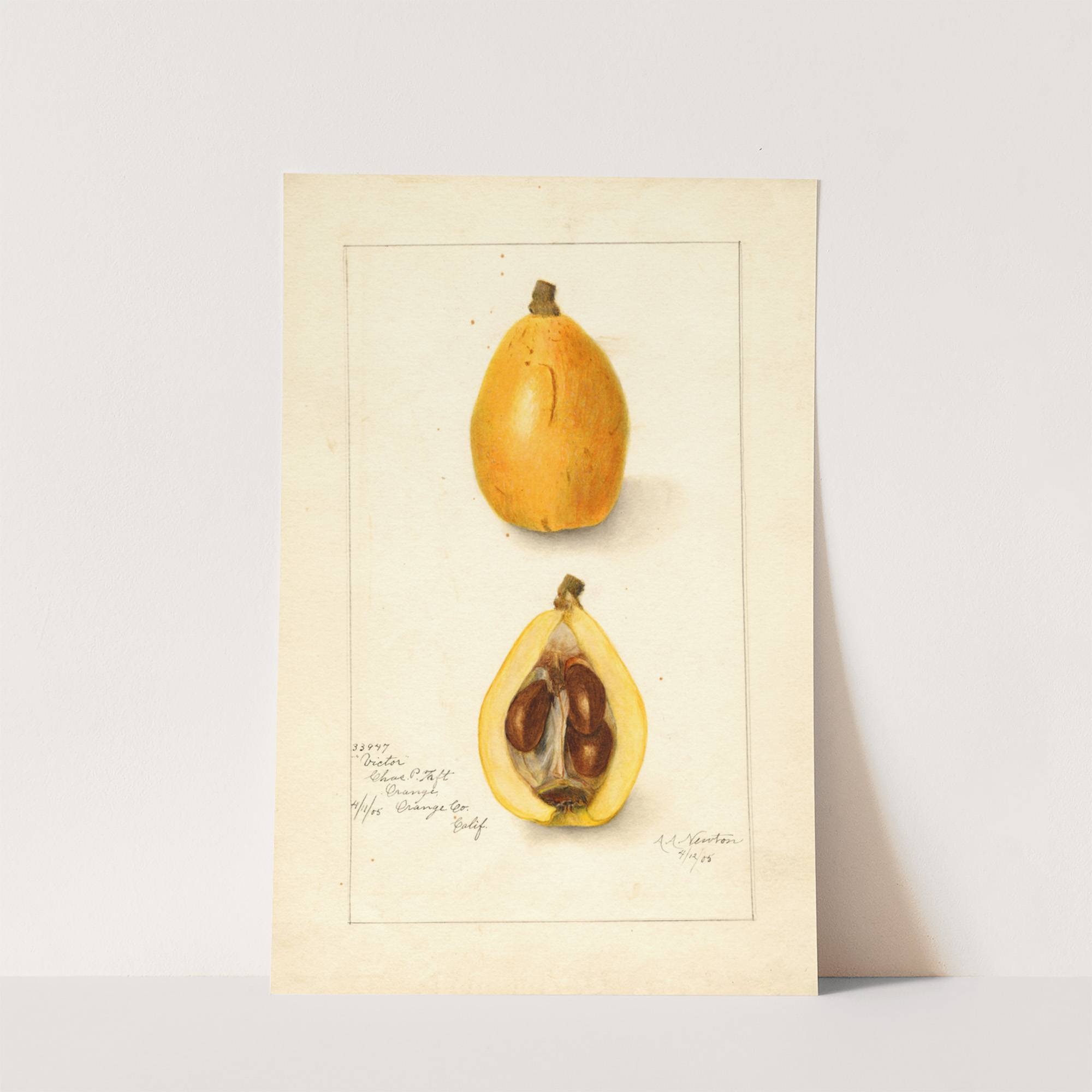 This vibrant art print showcases the botanical beauty of a cantaloupe melon, titled "Eriobotrya japonica: Victor" by artist Amanda Almira Newton. The composition features two views of the same cantaloupe melon: one whole and one halved to reveal its inner...