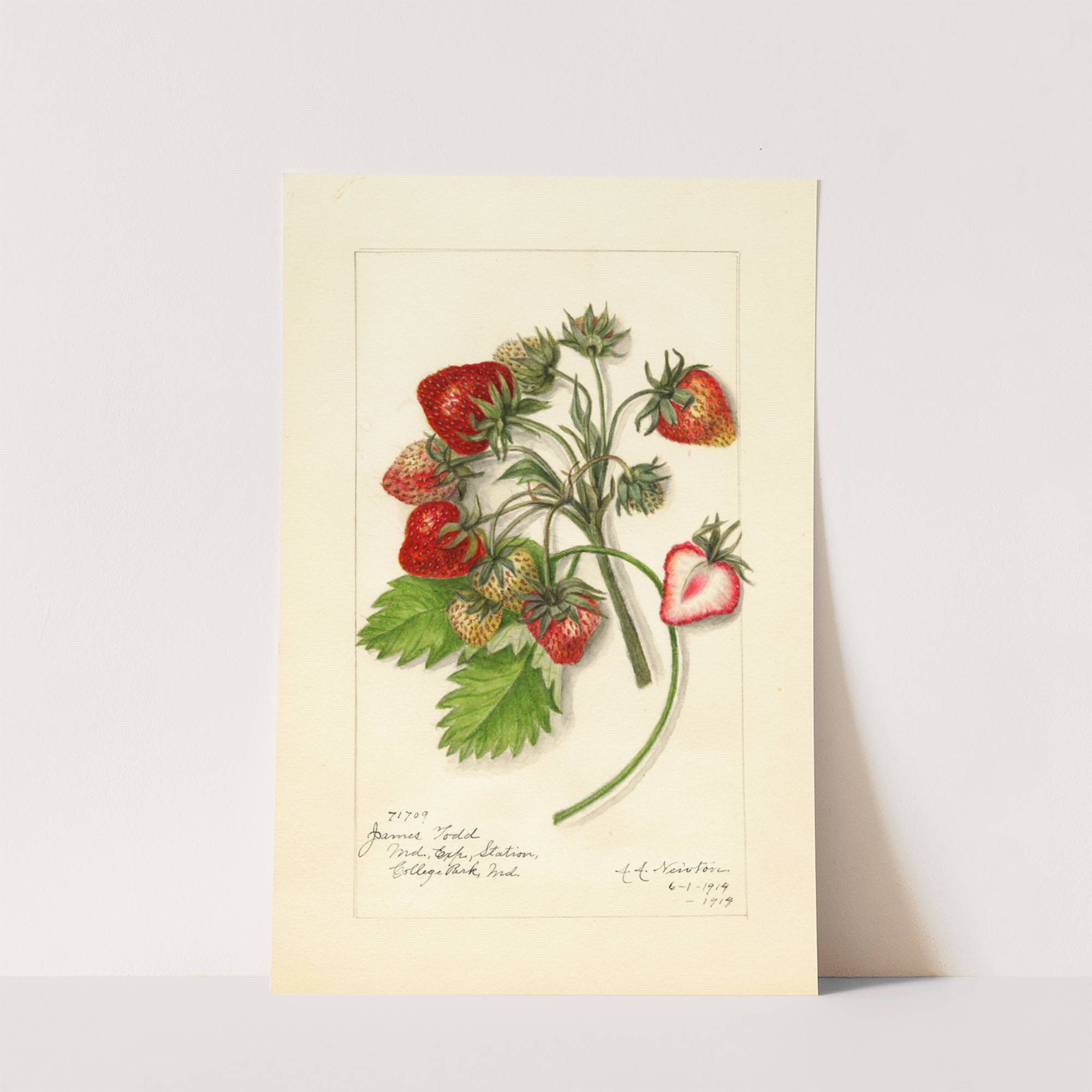 This exquisite botanical illustration, titled "Fragaria: James Todd" by Amanda Almira Newton, captures the vibrant essence of strawberries with meticulous detail. The artwork showcases several ripe strawberries in varying shades of red, from deep crimson to lighter rosy hues, each...
