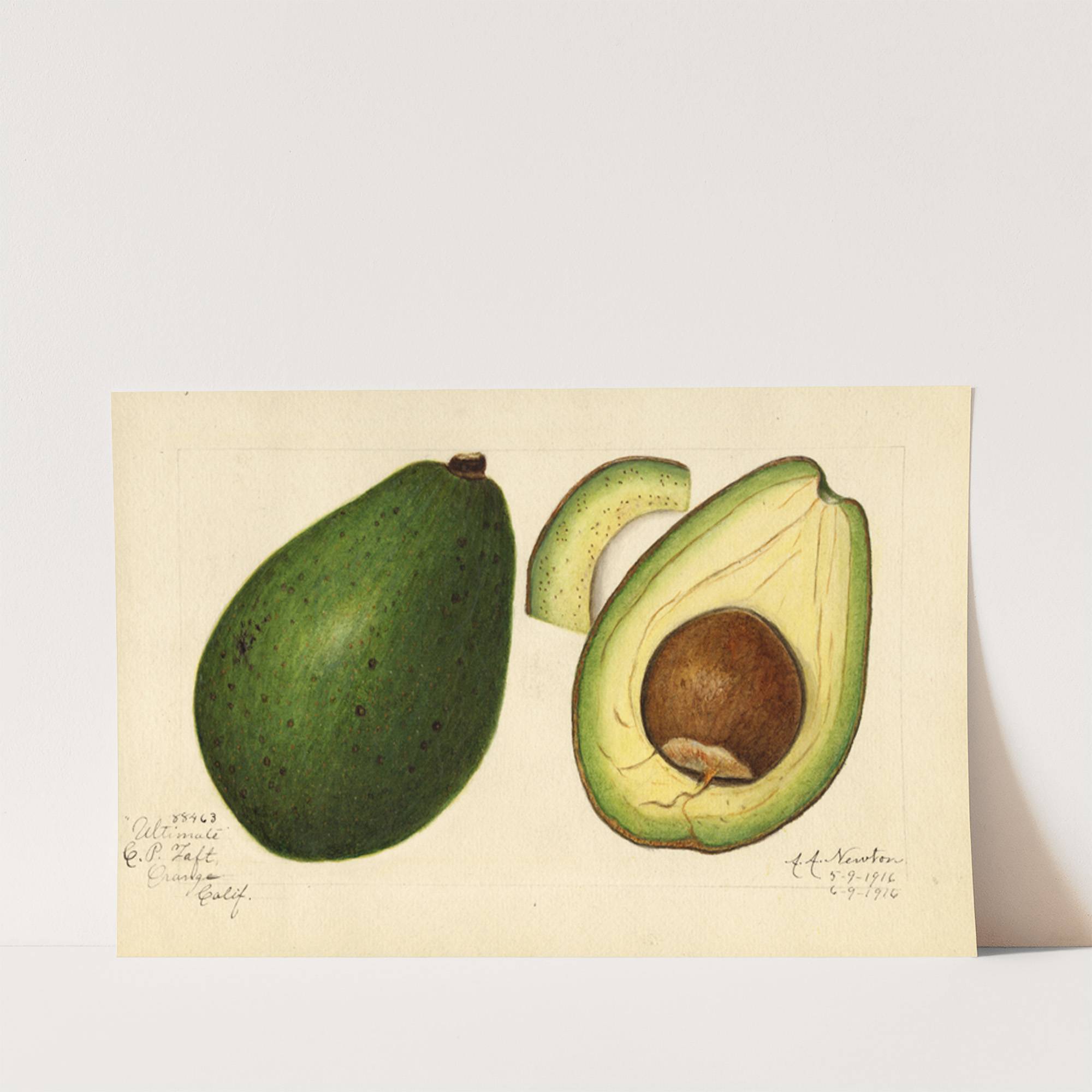 This art print features a meticulously detailed illustration of a ripe avocado, created by artist Amanda Almira Newton in her style titled "Persea: Ultimate." The artwork presents two views of an avocado: the whole fruit and a halved section. On...