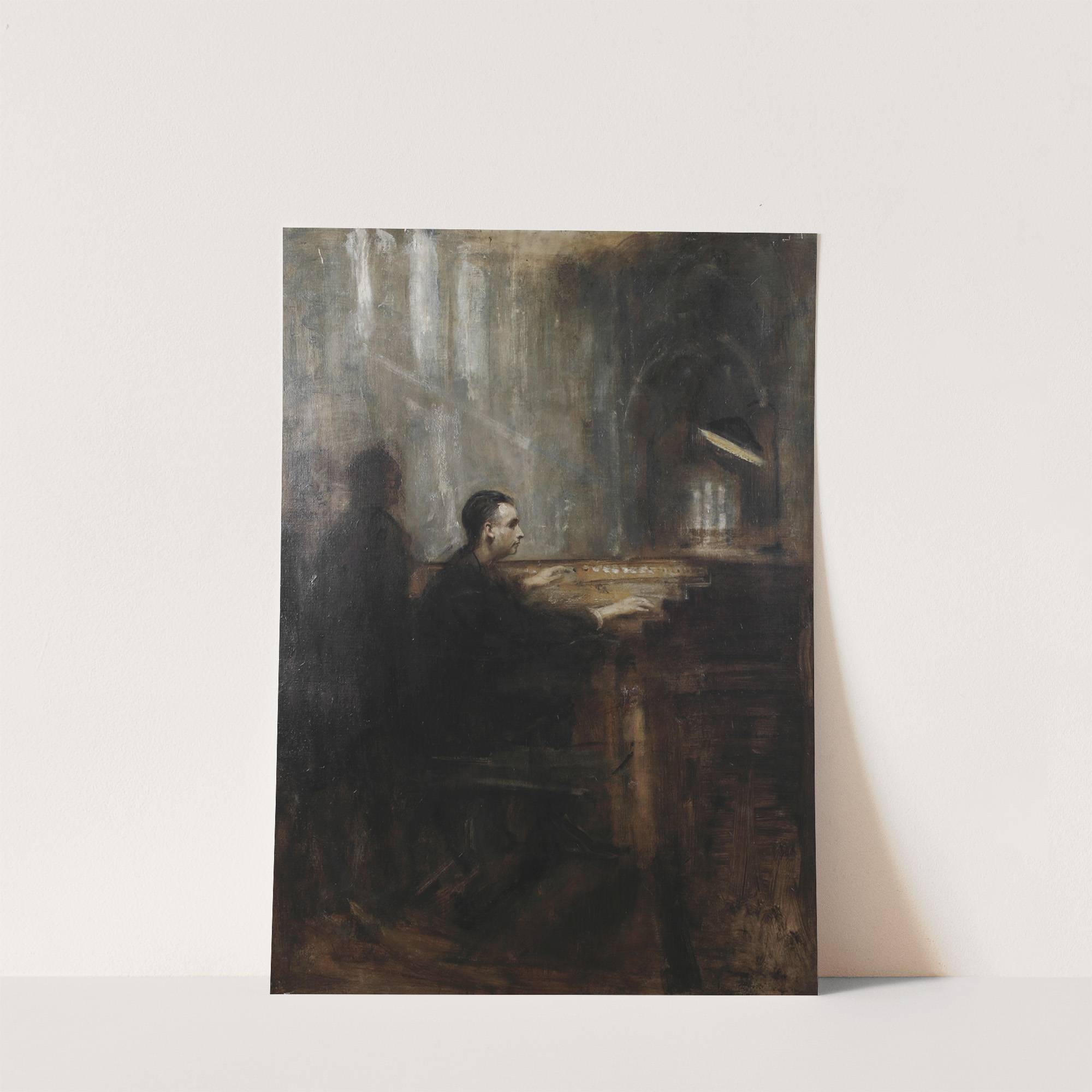 This artwork, "Monsieur Marcel Dupré at the Organ of Notre Dame" by Ambrose McEvoy, presents a hauntingly beautiful oil painting in an impressionistic style. It features Marcel Dupré, a renowned French organist, captured mid-performance within the dimly lit and architecturally...
