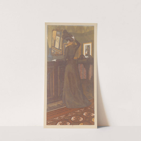 This art print features "Jeune femme se recoiffant – Mlle Marcolesco, belle-sœur de l’artiste" by Amédée Joyau from 1899. The artwork presents a beautifully rendered, vintage-style scene of a young woman standing in an elegantly furnished room. She is dressed...
