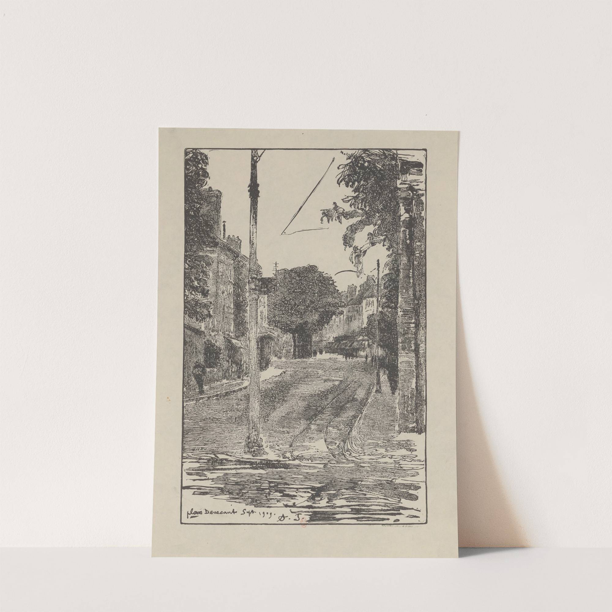This art print features "Place Denecourt (Fontainebleau) (1909)" by Amédée Joyau, a masterful example of early 20th-century monochrome ink drawing. The scene depicts a tranquil urban street, bathed in light and shadow, creating a dynamic yet serene atmosphere. The composition...