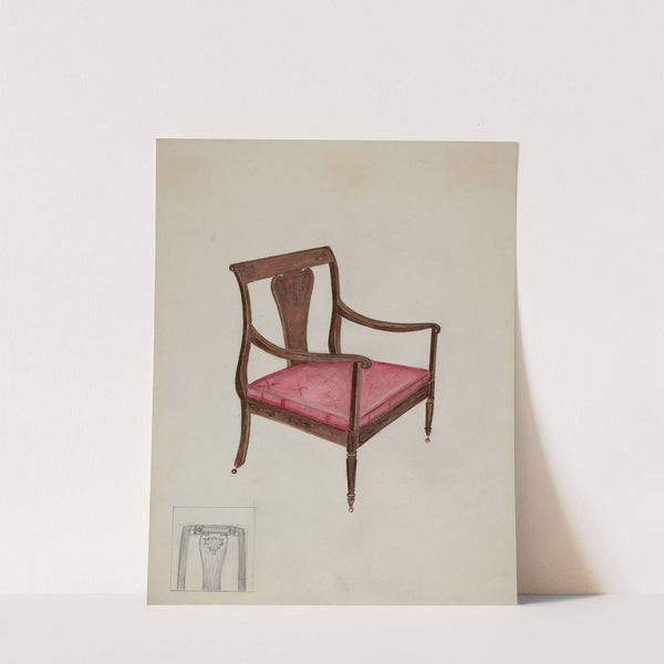 This elegant piece of artwork depicts "Arm Chair," a classic American 20th-century design with a timeless appeal. The chair features an intricately carved dark wooden frame that showcases both sophistication and craftsmanship. The wood is rich in color, showcasing a...